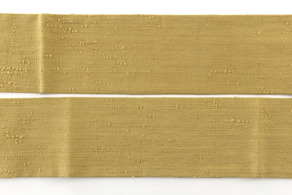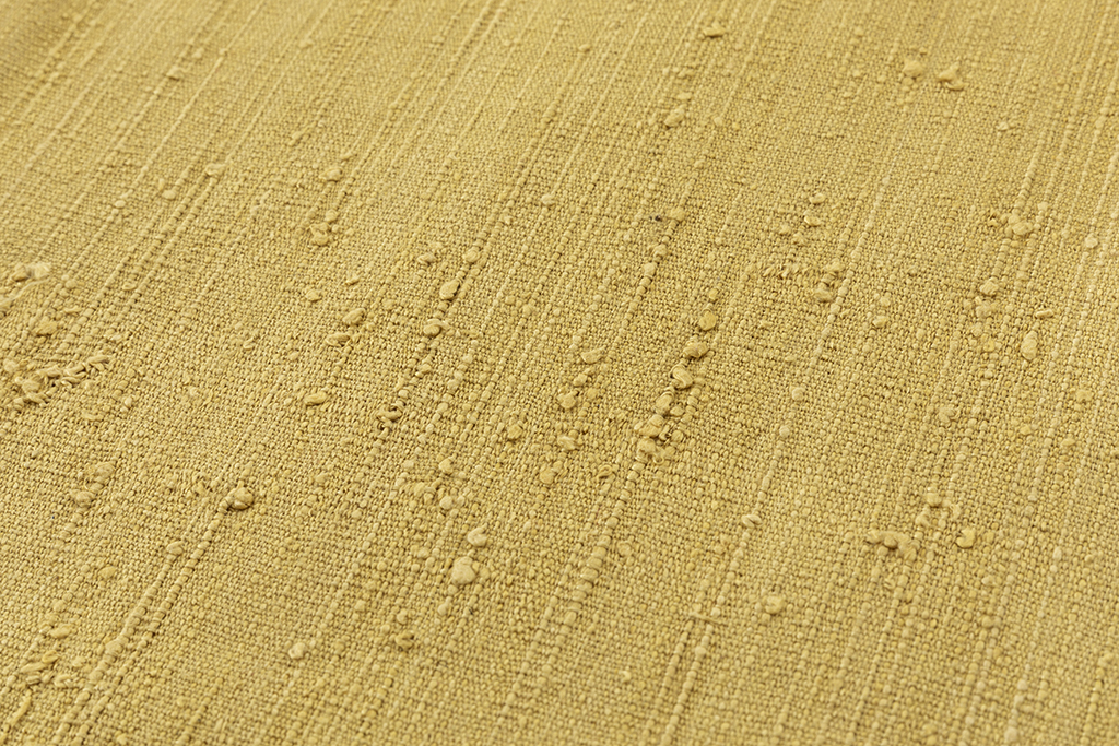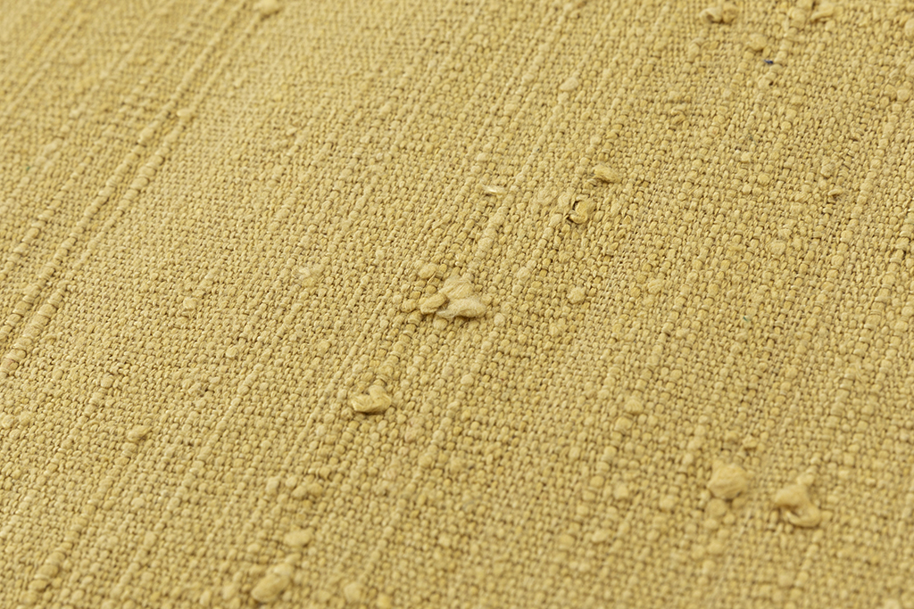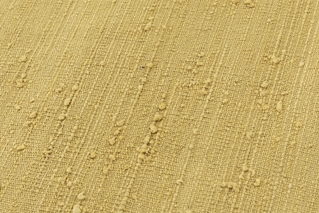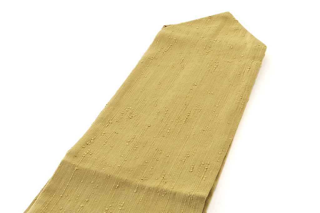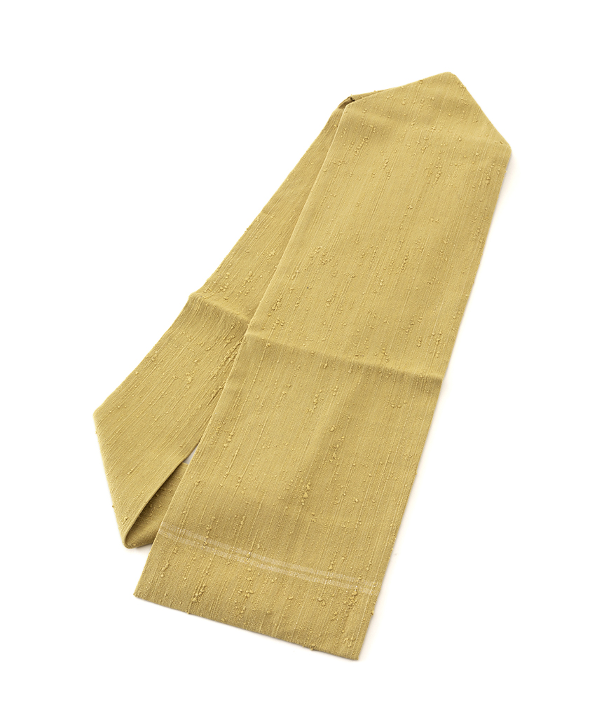 馴染みの良い刈安色の糸で織り出された、柔らかな色彩が生む朗らかな表情に、際立つ独特の節が野趣豊かな味わいを広げる、浦野理一作 縦節紬 九寸名古屋帯です。