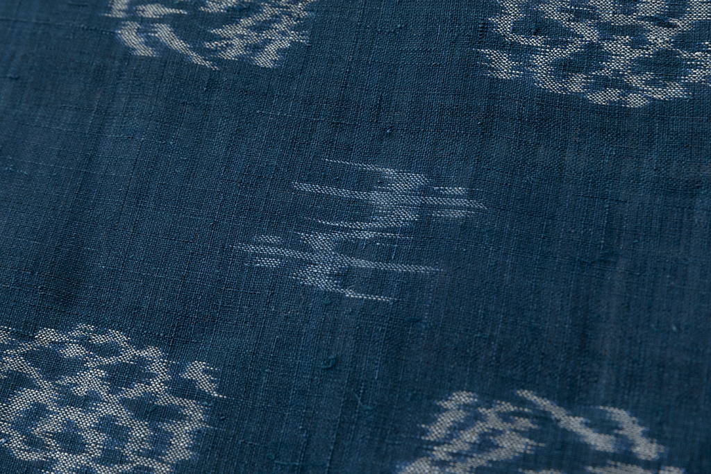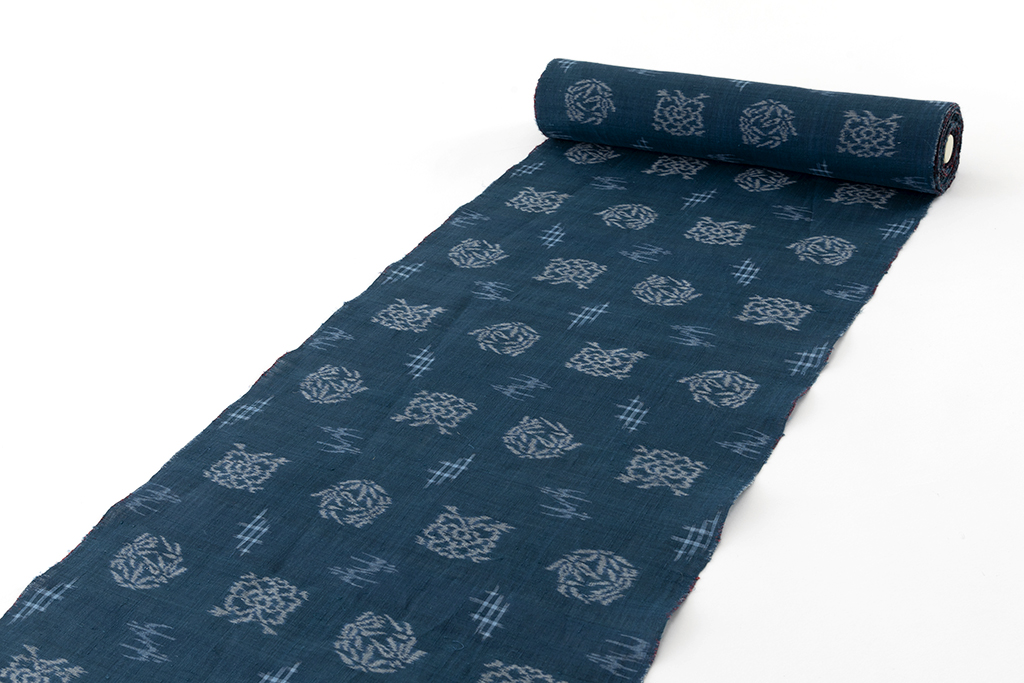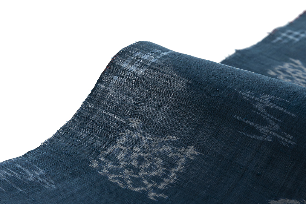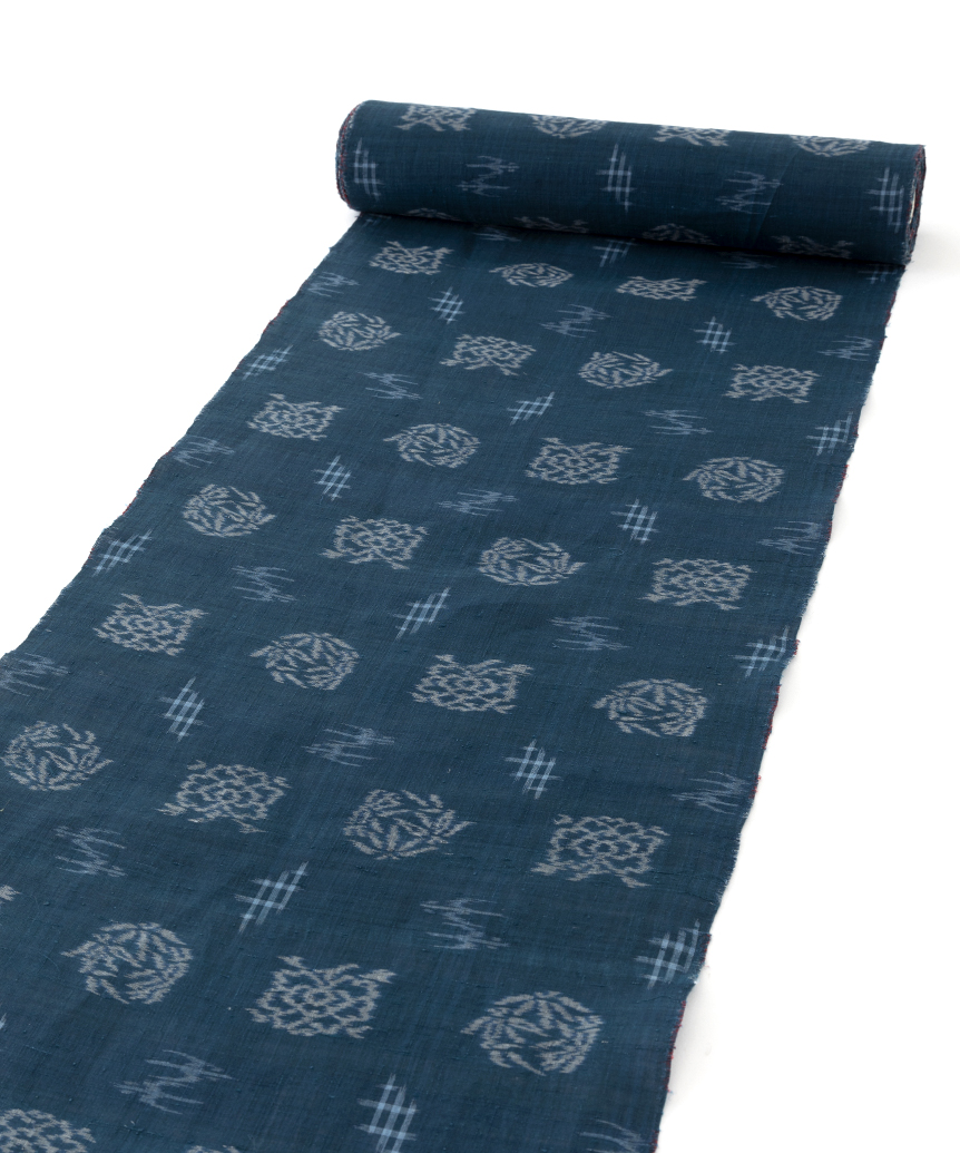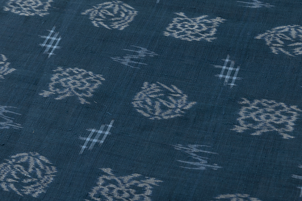 手績みの苧麻糸で織られた高麗納戸の越後上布地に、艶やかな花を咲かせる植物とともに素朴な絣模様を並べた、ひんやりとした肌触りが涼やかな着姿を引き立てる日本工芸会正会員 林宗平さん作 重要無形文化財 越後上布 着尺です。