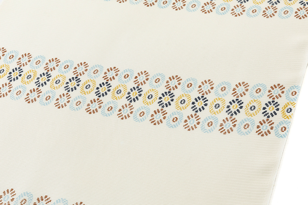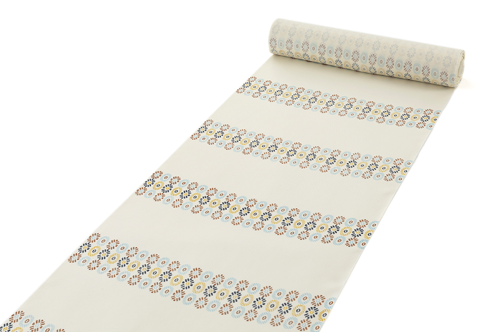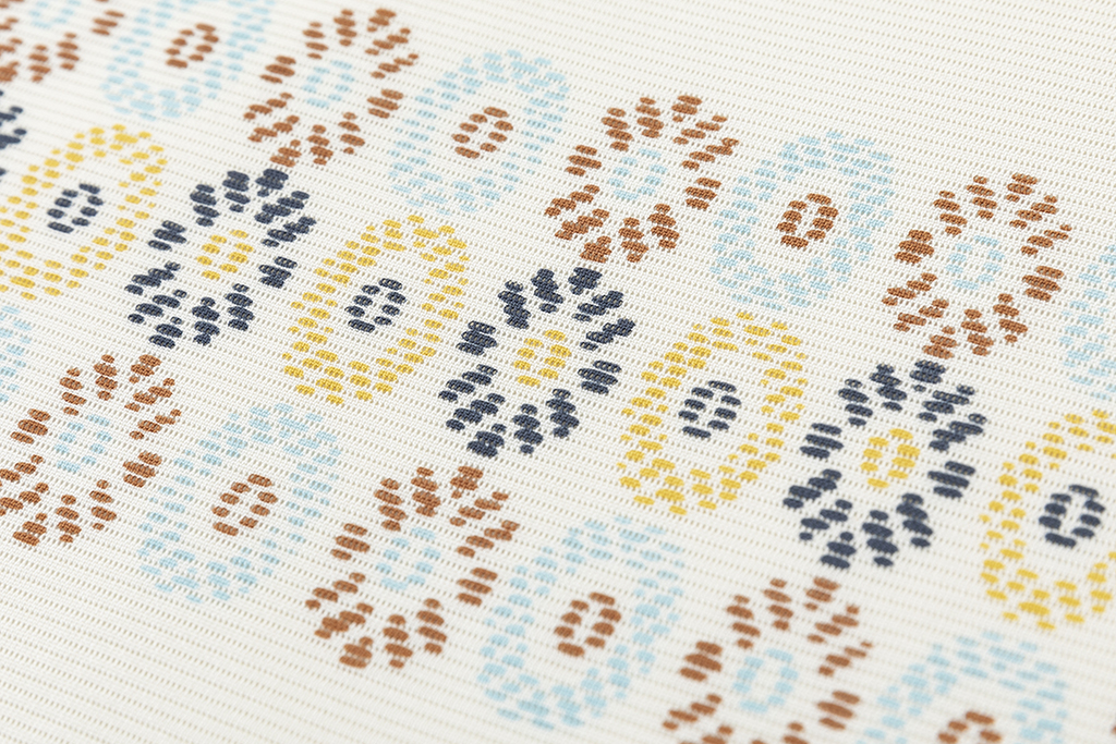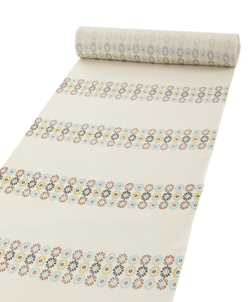 軽やかな胡粉色の絽の地に、水色、柿渋色、藤黄、濃紺を組み合わせて苺の断面のような可愛らしい丸紋を横段に並べた、淡く優しい景色に描かれた甘い愛らしさが麗しい着姿を引き立てる工芸きもの野口製 絽 小紋 着尺「小苺段」です。