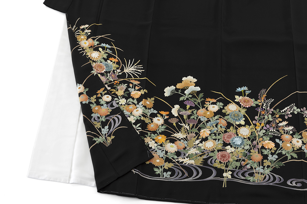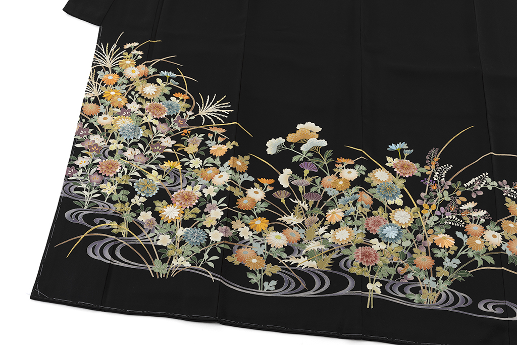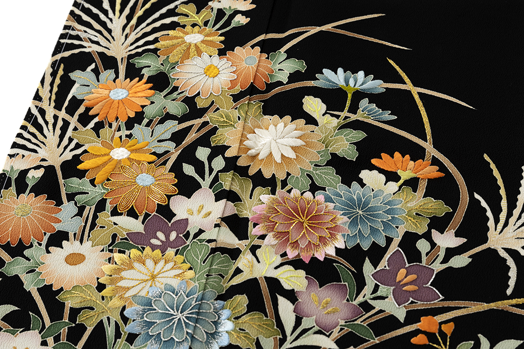 多彩な色調で、菊や女郎花、桐や桔梗を鮮やかに彩った、煌めく金銀の金駒刺繍、陰影を深める綿密な刺繍、繊細な濃淡で表現された艶やかな色彩が優美な華やかさを演出する東京染繍 大彦製 留袖です。