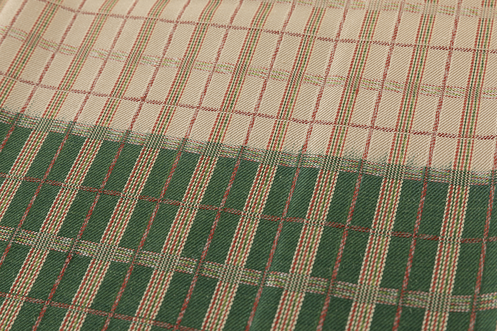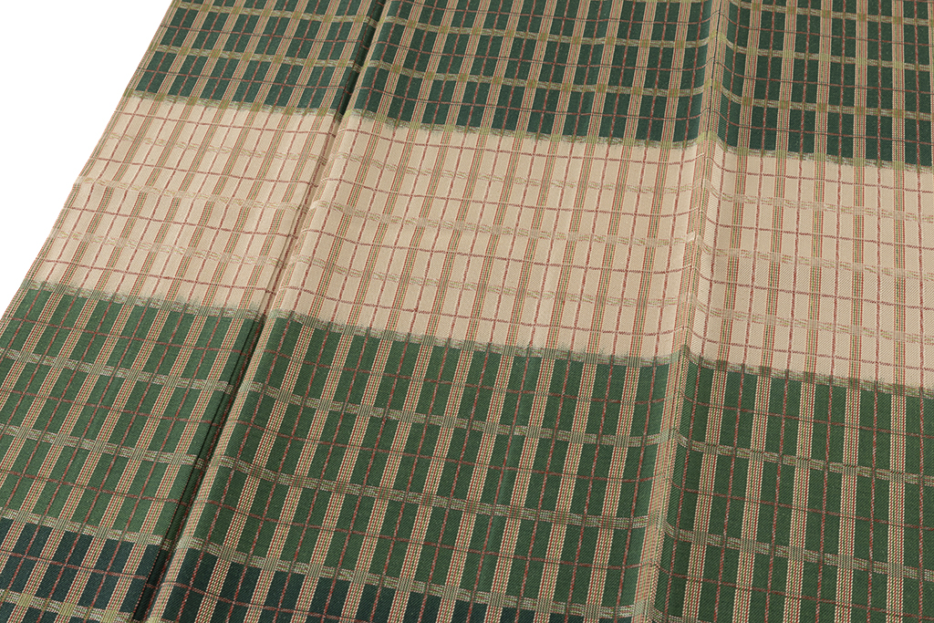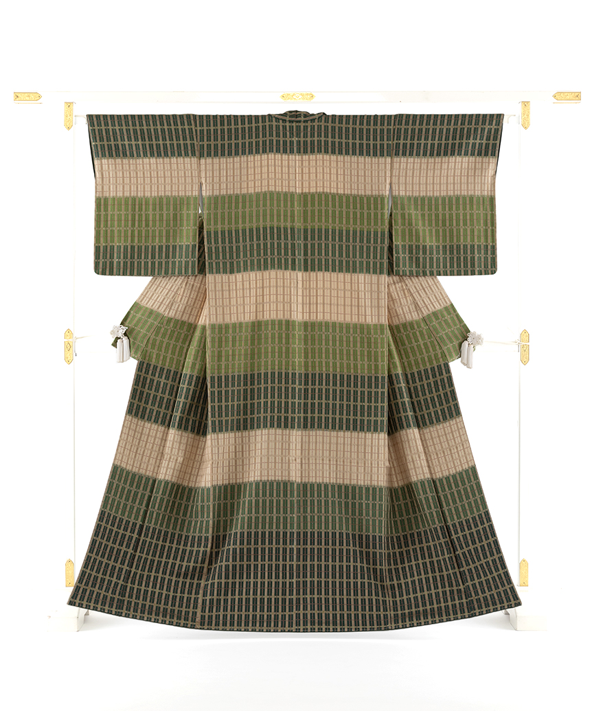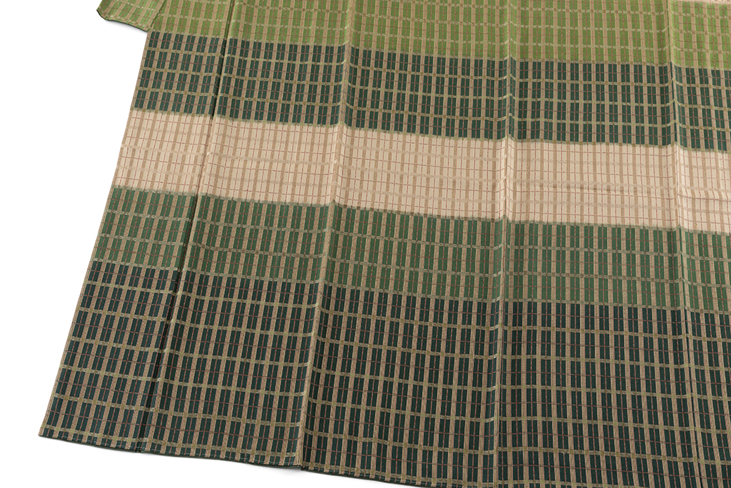 柘榴色や夏虫色の色糸を用いた緻密な織で、格子柄を織り出し、象牙色、夏虫色、萌黄色の熨斗目を表現した、艶やかな絹の光沢、草木の温もりを感じる色彩にモダンな表情が、上質な織味を引き立てる柳崇さん作 熨斗目 紬訪問着です。センスに富んだカジュアルな装いをお楽しみください。