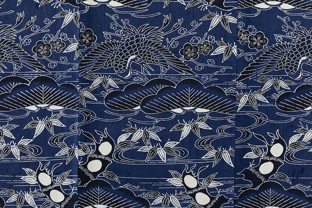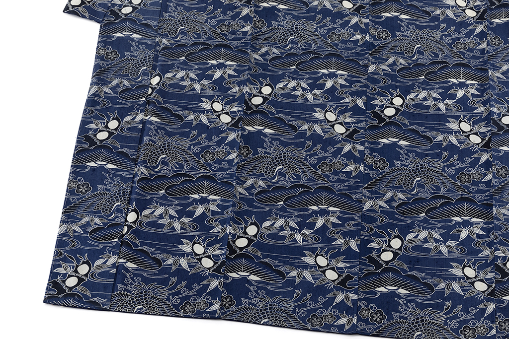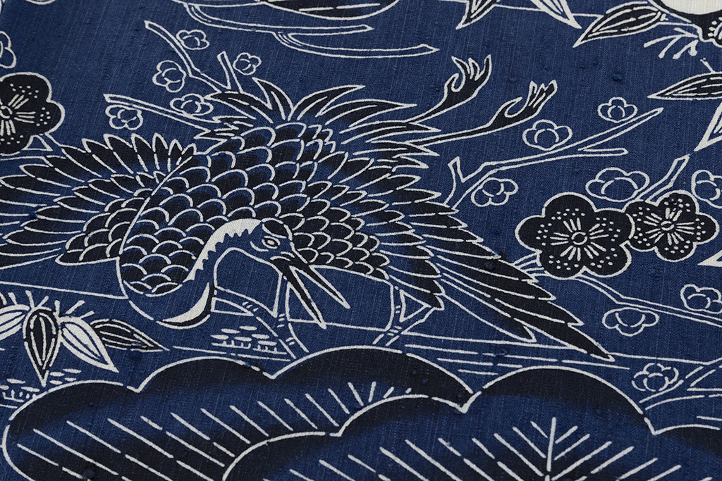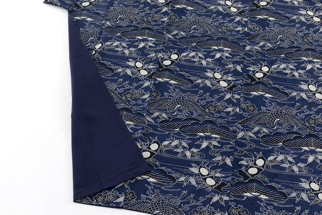 紺青の縦節紬地に、大きな松や梅、笹を描き、大きく羽を広げ、悠々と舞う鶴を描いた、際立つ大きな節に力強い意匠が存在感を際立たせる浦野理一さん作の型絵染 縦節紬 着物です。
