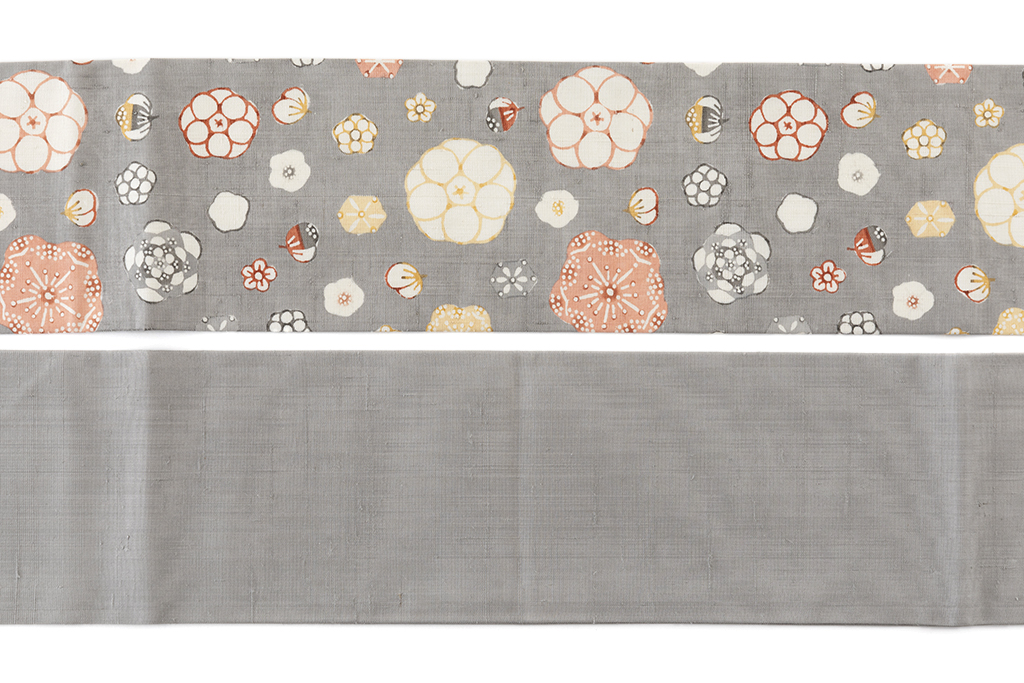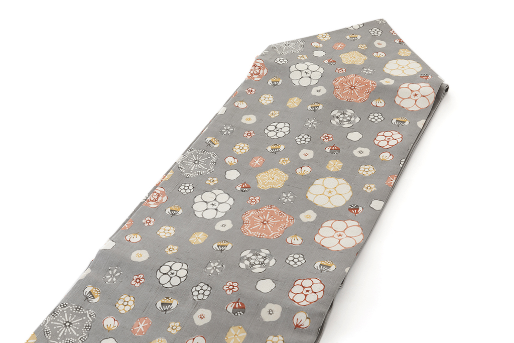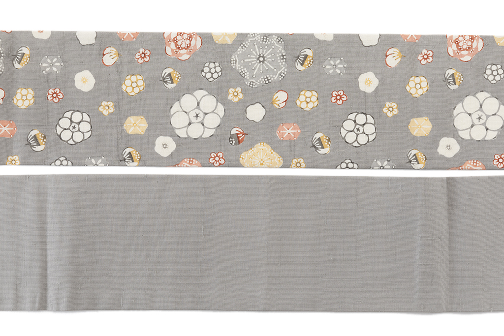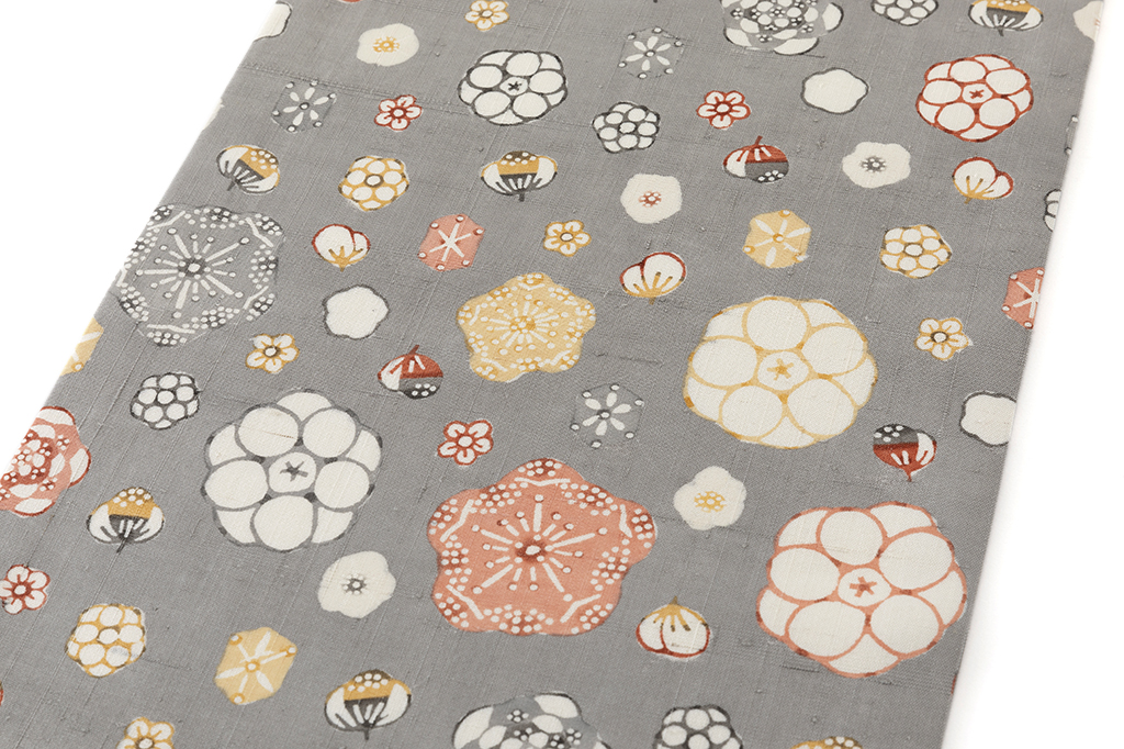 錫色の紬地に、梅や椿、水仙などにも見てとれる多様な花々を満開に咲き開かせた、個性豊かな花々が魅せる多彩な表情、温かく自由な感性が優しく幸福感で包み込んでくれる、国画会会員 岡本紘子さん作 型絵染 紬九寸名古屋帯「花二月」です。