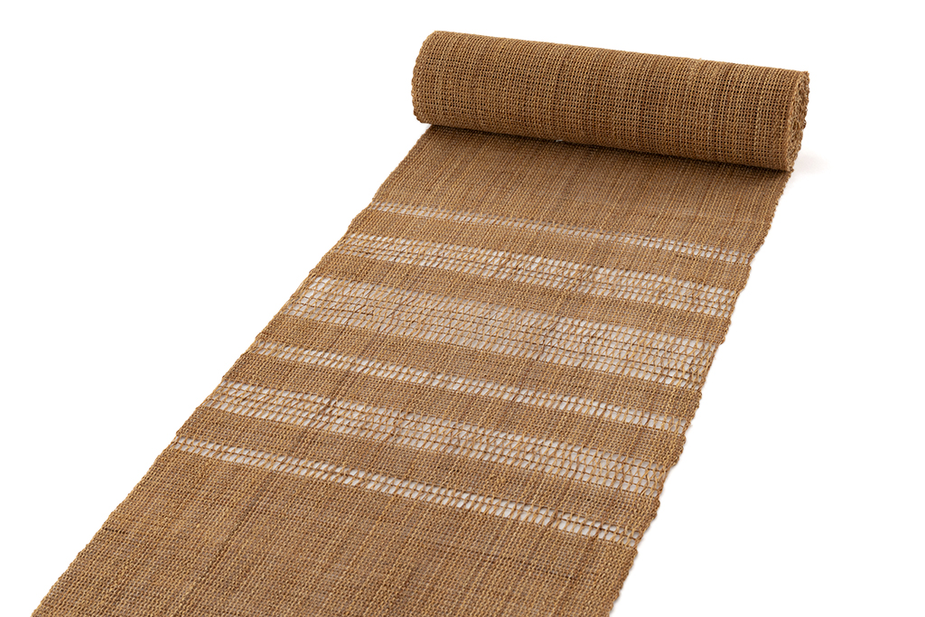 「シナノキ」や「オオボダイジュ」の樹皮からつくられる「科布(しなふ)」は、葛布・芭蕉布と並ぶ日本三大古代布のひとつ。今では新潟県や山形県の一部地域のみで生産されています。樹皮から採れる靭皮(じんぴ)繊維をはいで、灰汁で煮て薄く裂き、出来上がった糸で丹念に織り上げます。通気性がよく、軽く、水濡れにも強く、使いつづけるほどに味わいが増す織物です。素朴で野趣味のあるざっくりとした生地感を活かして八寸名古屋帯や角帯、草履やバッグなどが作られ、盛夏の装いに最適です。2005年に「羽越しな布」が伝統工芸品に指定。