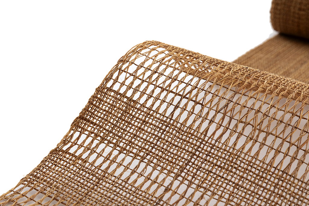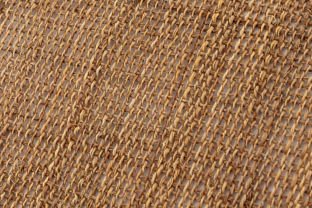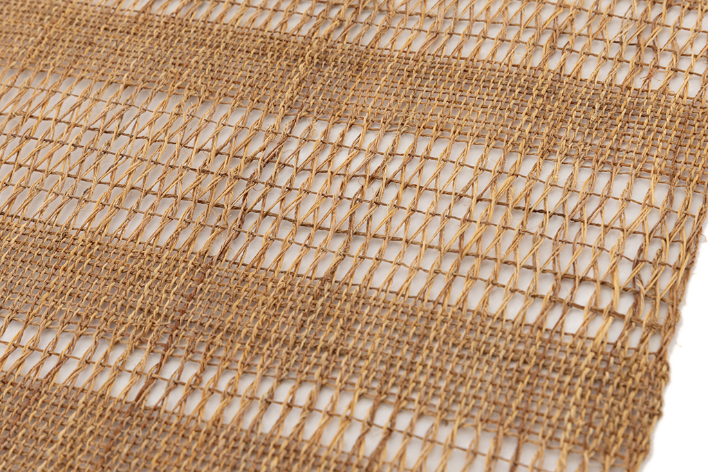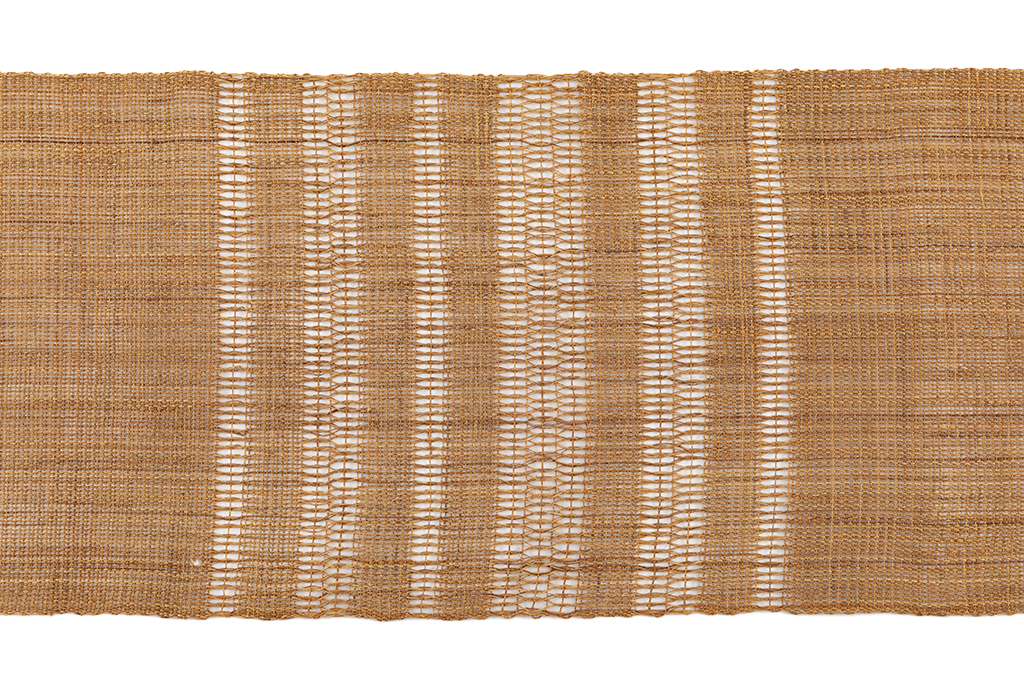 ざっくりとした手触りの科布の地に、複雑に絡み交差することで、多様な表情を見せる捩り織を施した、繊細な織組織が吹き抜ける空間と美しい余白が、野趣豊かな素材味を深める科布 捩り織 八寸名古屋帯地です。
