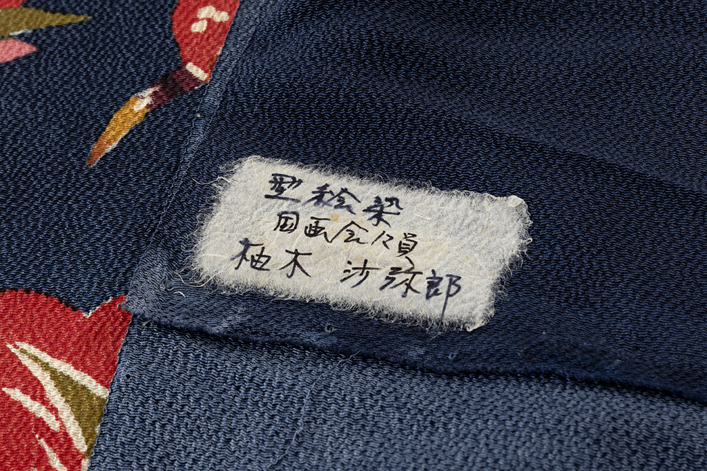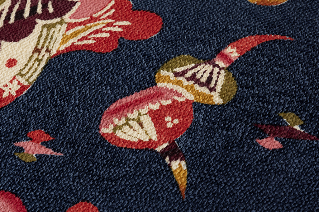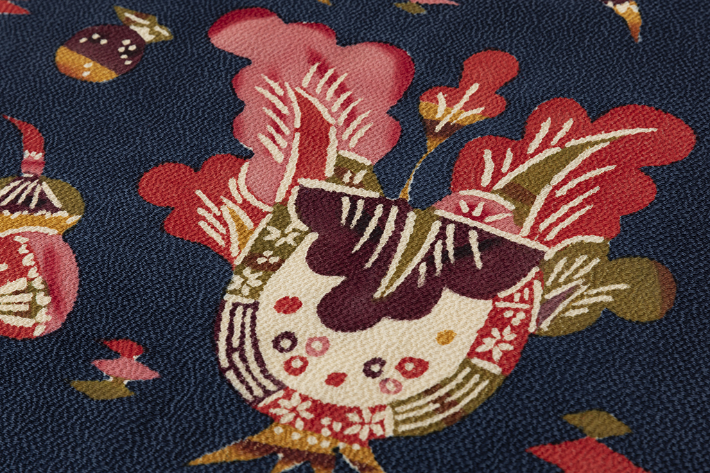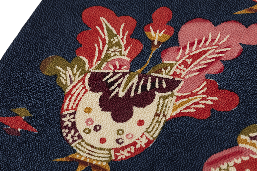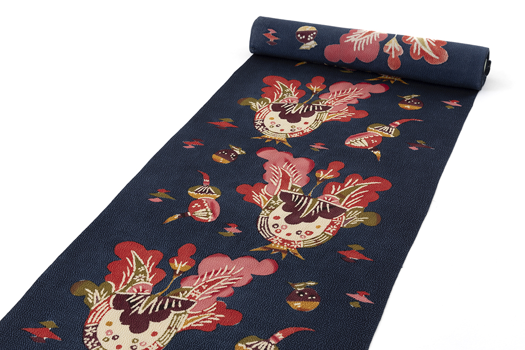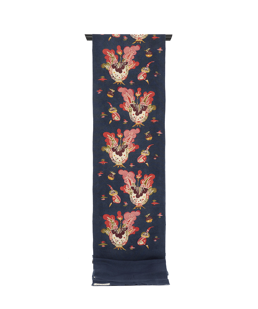 濃藍の縮緬地に、柔らかな丸みを帯びたモチーフで、花瓶に飾られた草花を鮮やかな彩りで可愛らしく描いた、楽し気な装いを演出する国画会会員 柚木沙弥郎さん作 九寸名古屋帯地です。