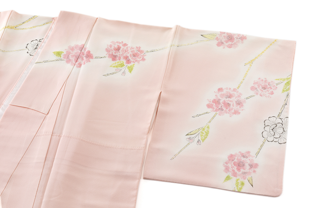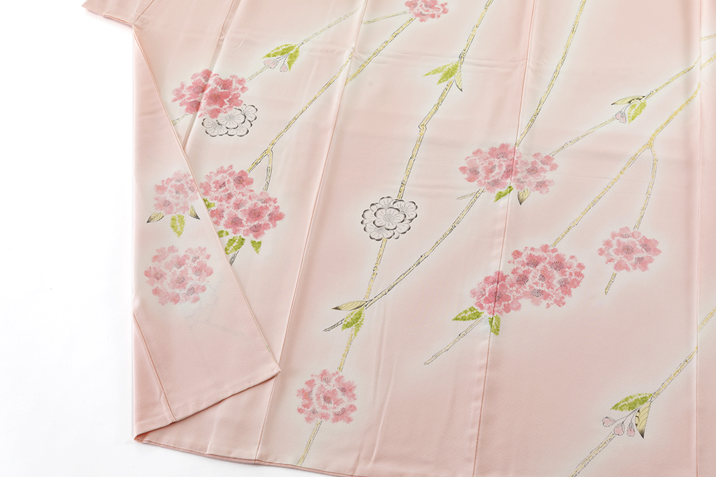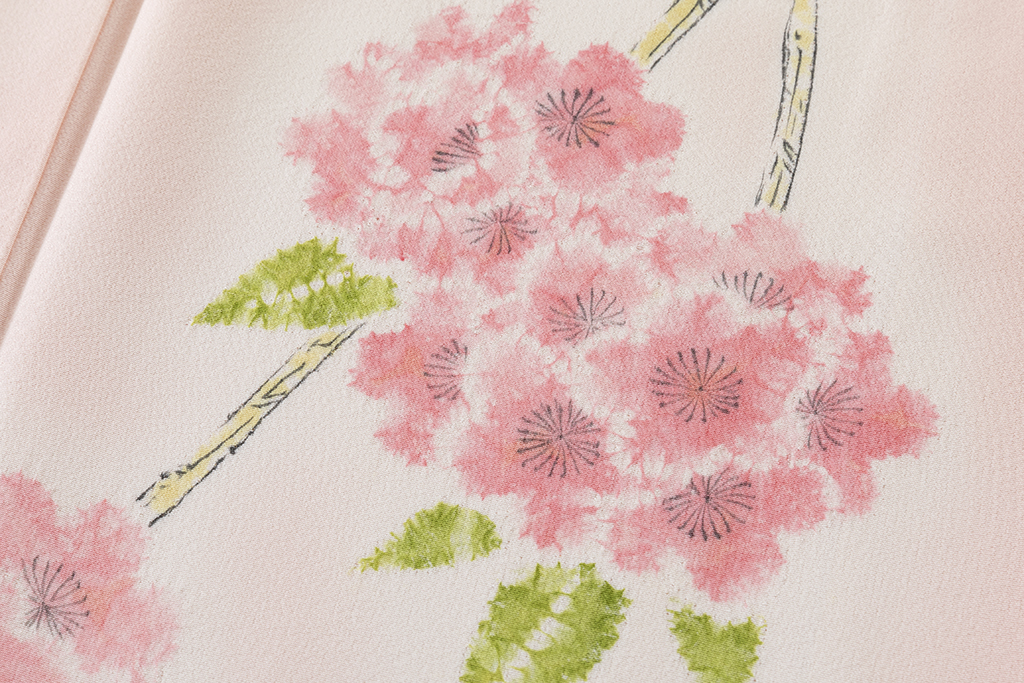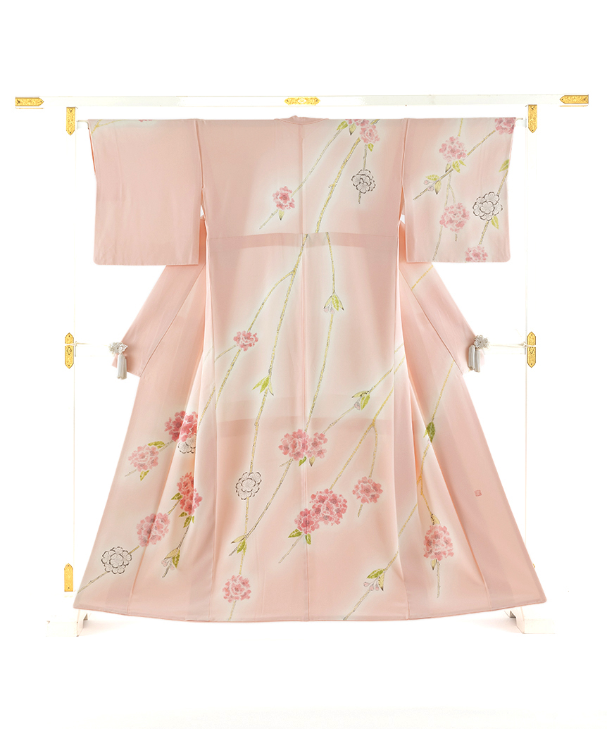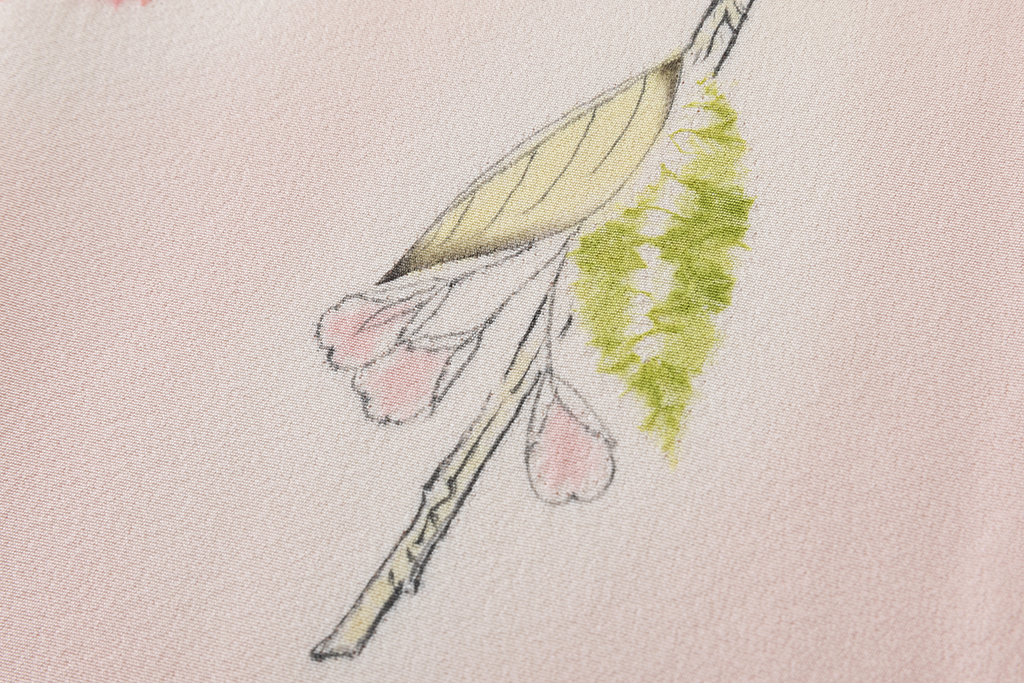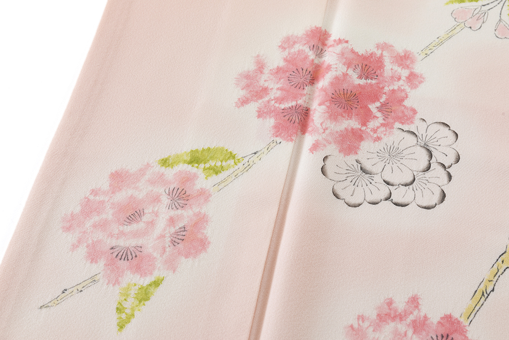 淡い曙色の暈しの地に、繊細な墨書き、柔らかな絞りで、可憐な花を咲かせ、枝葉を伸ばす艶やかな梅を描いた、はんなりと上品な華やぎが美しい着姿を引き立てる日本工芸会正会員 小倉淳史さん作 訪問着です。