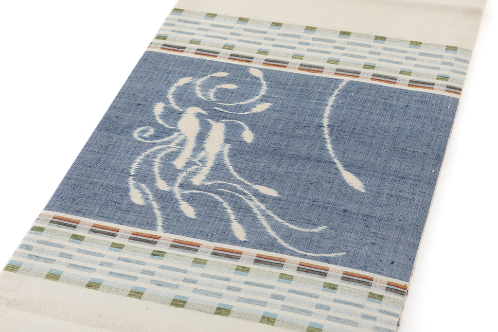 上品な乳白色の地に、多彩な色糸を用いた紋織を織り出し、オナガのような2羽の小鳥が木々の上で仲良く戯れる様子を繊細な絵絣で映し出した、穏やかな色彩が調和するモダンな優しい世界に、詩情豊かな景色を映し出した、柔らかく優美な着姿を引き立てる人間国宝 佐々木苑子さん作 紬開き九寸名古屋帯です。