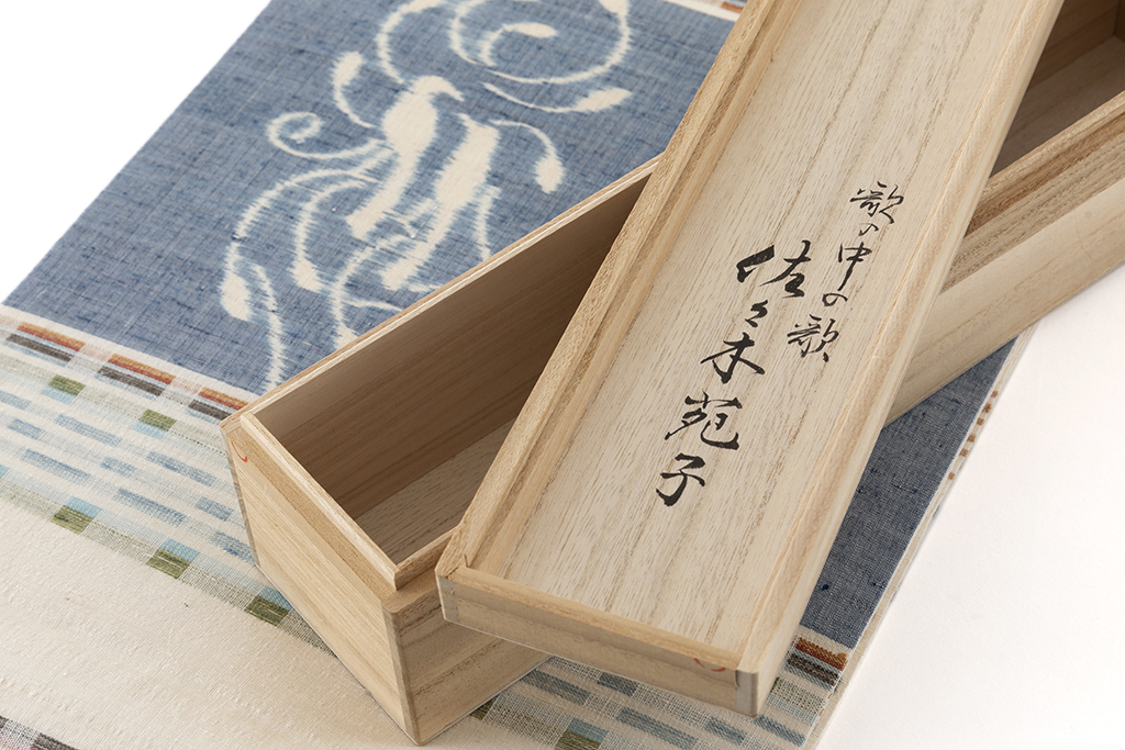 1939年東京に生まれた佐々木苑子さんは、20代半ばから染織を志し、静岡県の手織り紬工房で平織・縞・格子の技術を学ばれ、1969年に自宅に織物工房を設立し、1971年に紬織の作品で伝統工芸新作展に初入選されました。その後、紬織と絣の研究に専念し、曲線で表現する絵絣の技を求めて、鳥取県の弓浜絣と島根県の広瀬絣を学び、鳥や花、星や月などの身近な自然のモチーフから図柄を創案し、多彩な植物染料で染めた紬糸の繊細華麗な絵絣に表すことに挑まれ、品格ある芸術性の高い紬織の絵絣へと展開させました。従来の直線的・抽象的な絣文様に加え、より繊細で詩情に満ちた絵絣を取り入れ、写生に基づく図案に沿って幾何学文様と絵絣を活用することで、独自の作風を築かれました。伝統的な紬織の技法に根差しつつ、デザイン面ではオリジナリティを前面に出し、唯一無二の前衛作家として魅力的な着物の数々を生み出されています。