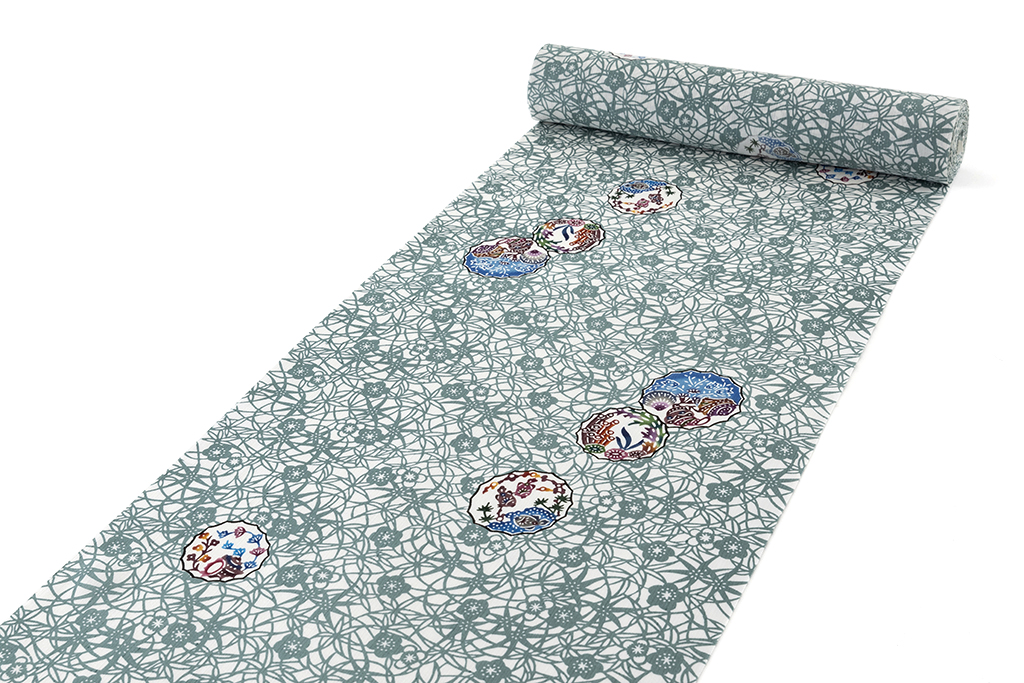 軽く涼やかな小千谷紬の白地に、美しい草花の文様を描き、ミーカガンでのぞいた世界をくり抜くように、魚や貝、海藻などの海の世界を鮮明に描いた、しなやかで爽やかな地風に、生命の愛らしさを感じる豊かな色彩が美しい着姿を引き立てる日本工芸会正会員 城間栄順さん作 小千谷紬 本紅型染 小紋 着尺 「窓絵」です。