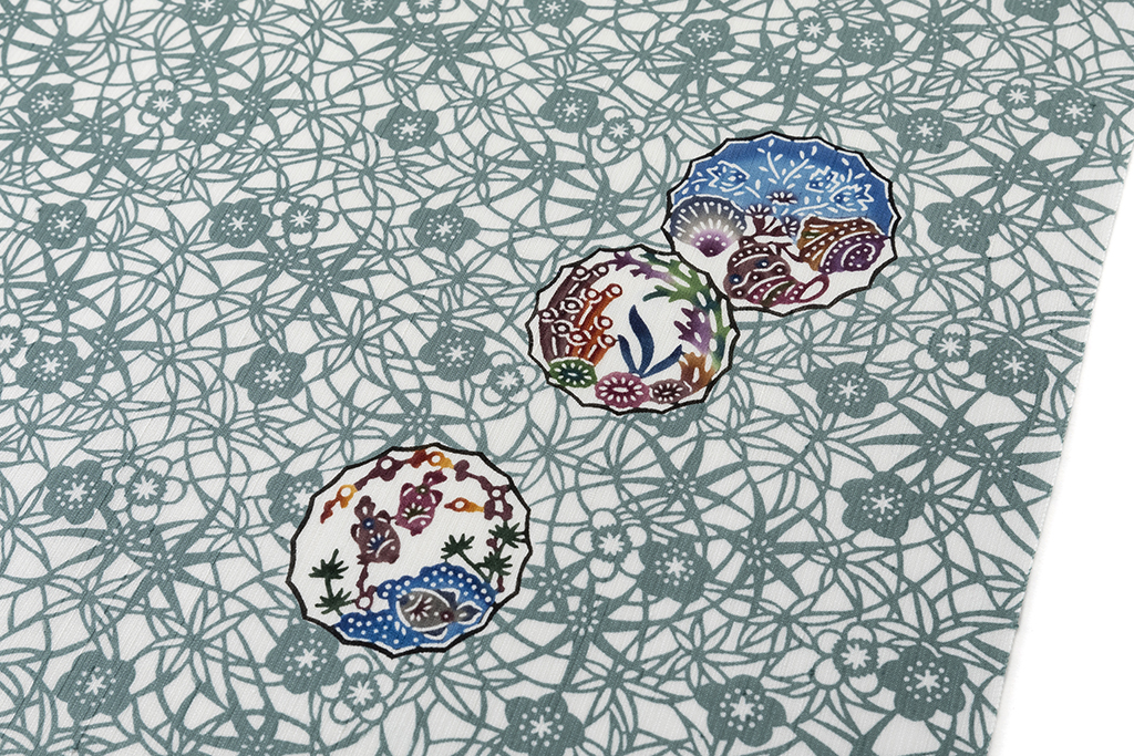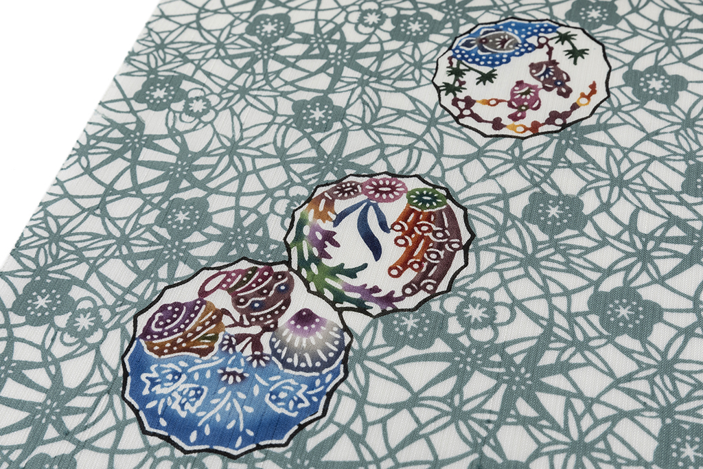 風物では桜や梅、柳、菖蒲、雪持笹、雀、蝶など、友禅や江戸小紋と同じような文様も多く、他には鶴や亀、松竹梅、鳳凰などの吉祥文もよく使われています。