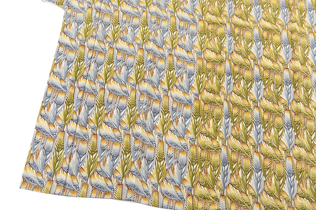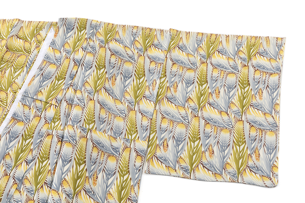 清らかな真珠色の地に、青朽葉や薄藍で生い茂る麦を一面に型染めした、艶やかな色彩のグラデーションが美しく、温かな陽の光を十分に浴びて移り変わる表情を映し出した、暖かく穏やかな風の中に力強い生命力を感じる、洗練された技術が豊かな表情を生む日本工芸会正会員 溝口あけみさん作 型絵染 単衣 訪問着「麦文」です。