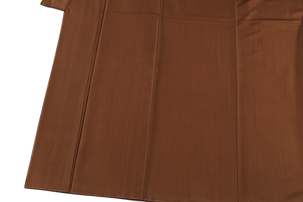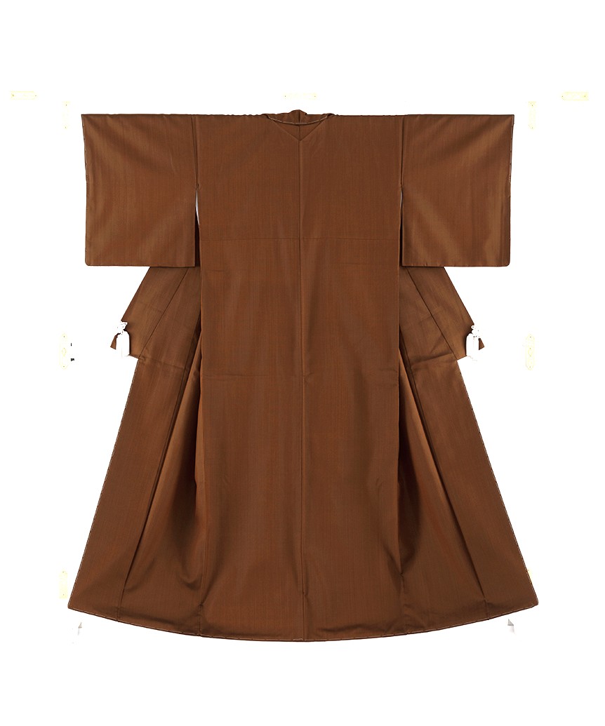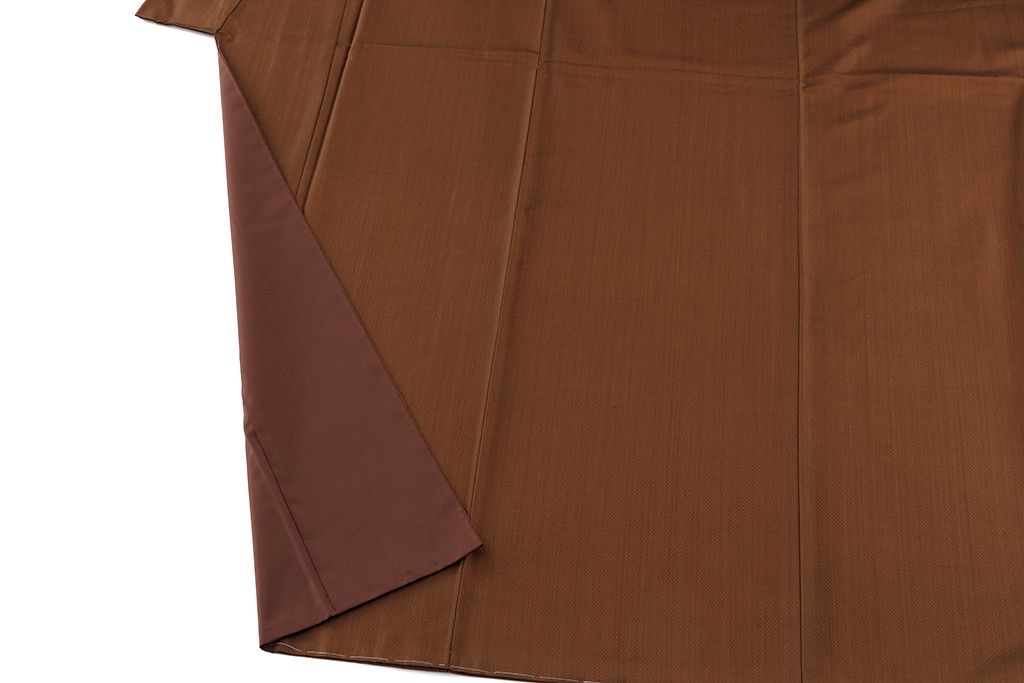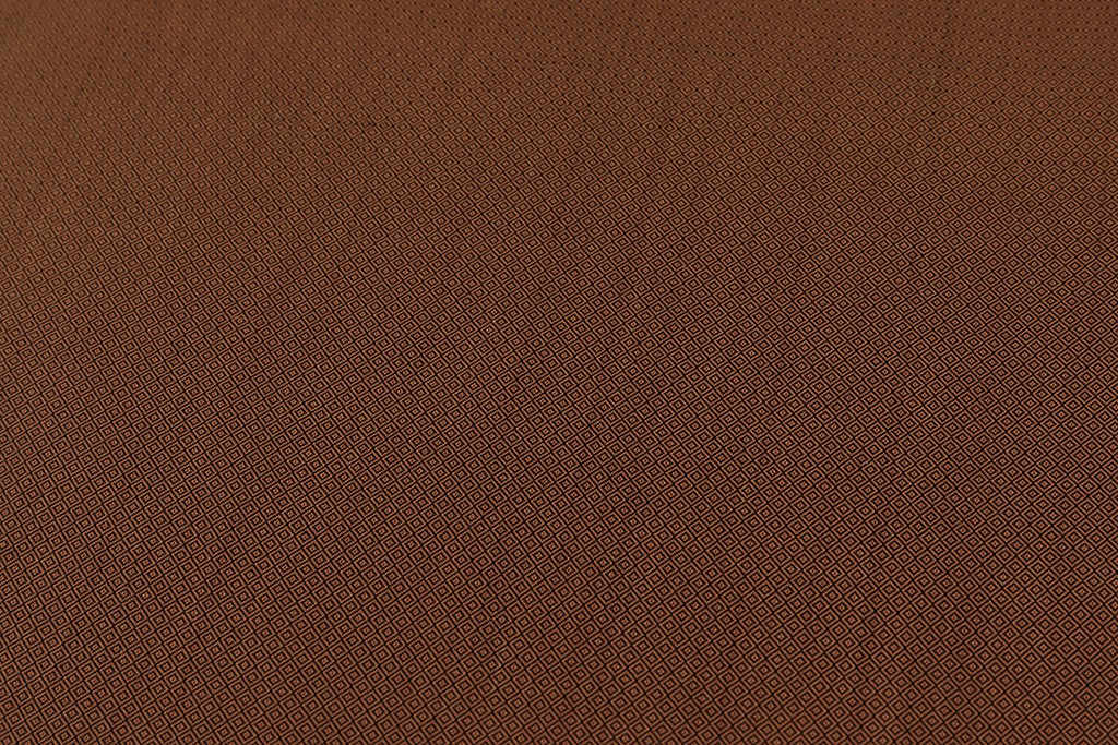 樺茶の色に、精緻な綾織で、二重の菱が重なるように細かな入り子菱の形を織り連ねた、独特の艶感、しっとりとした光沢とともに広がるシックな景色が上質な品格を漂わす、本場黄八丈 着物 「まるまなこ」です。
