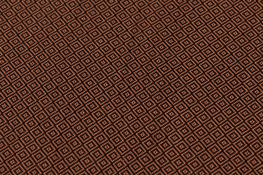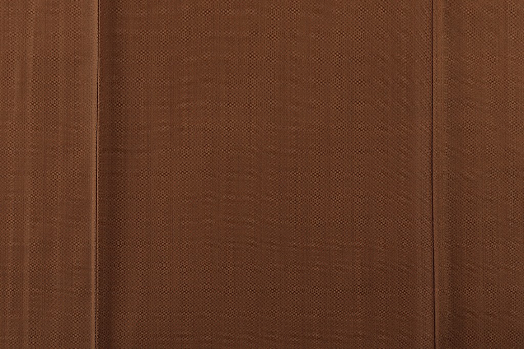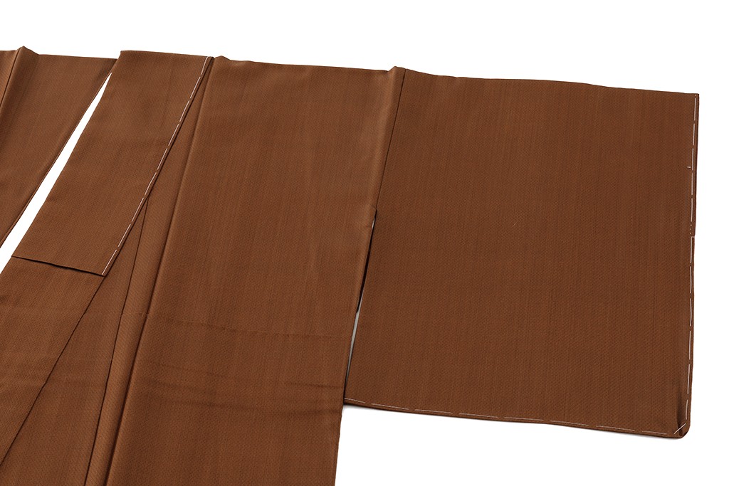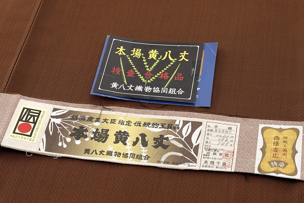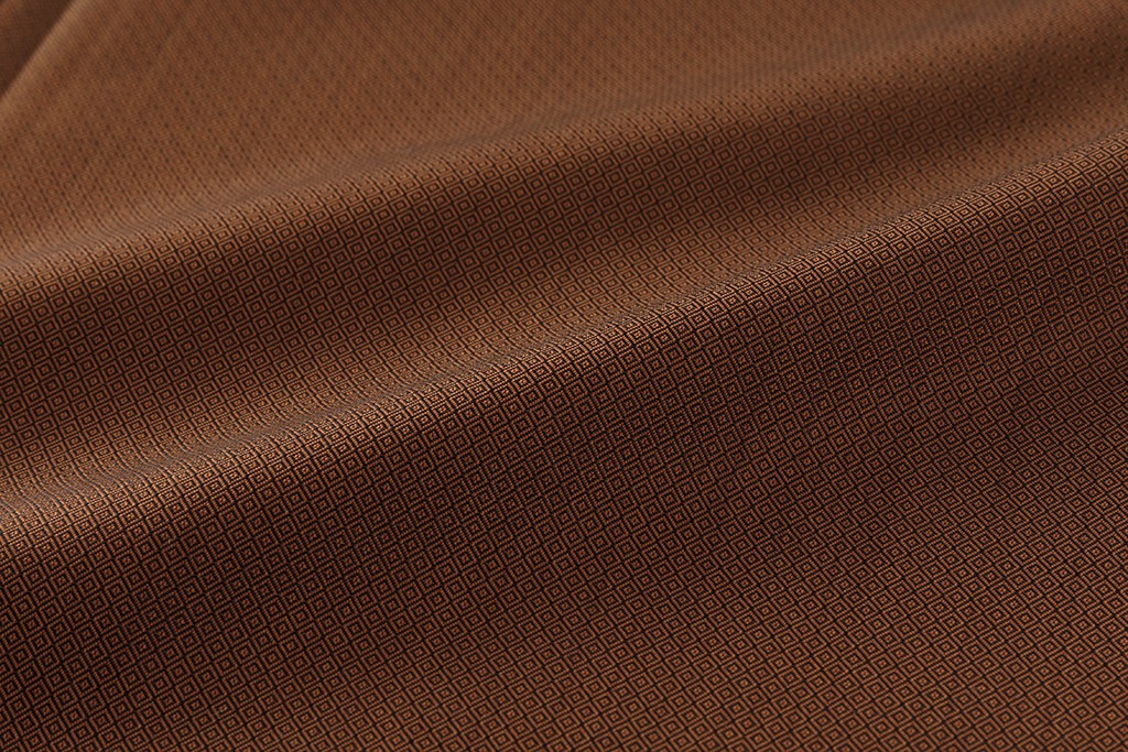 樺茶の色に、精緻な綾織で、二重の菱が重なるように細かな入り子菱の形を織り連ねた、独特の艶感、しっとりとした光沢とともに広がるシックな景色が上質な品格を漂わす、本場黄八丈 着物 「まるまなこ」です。