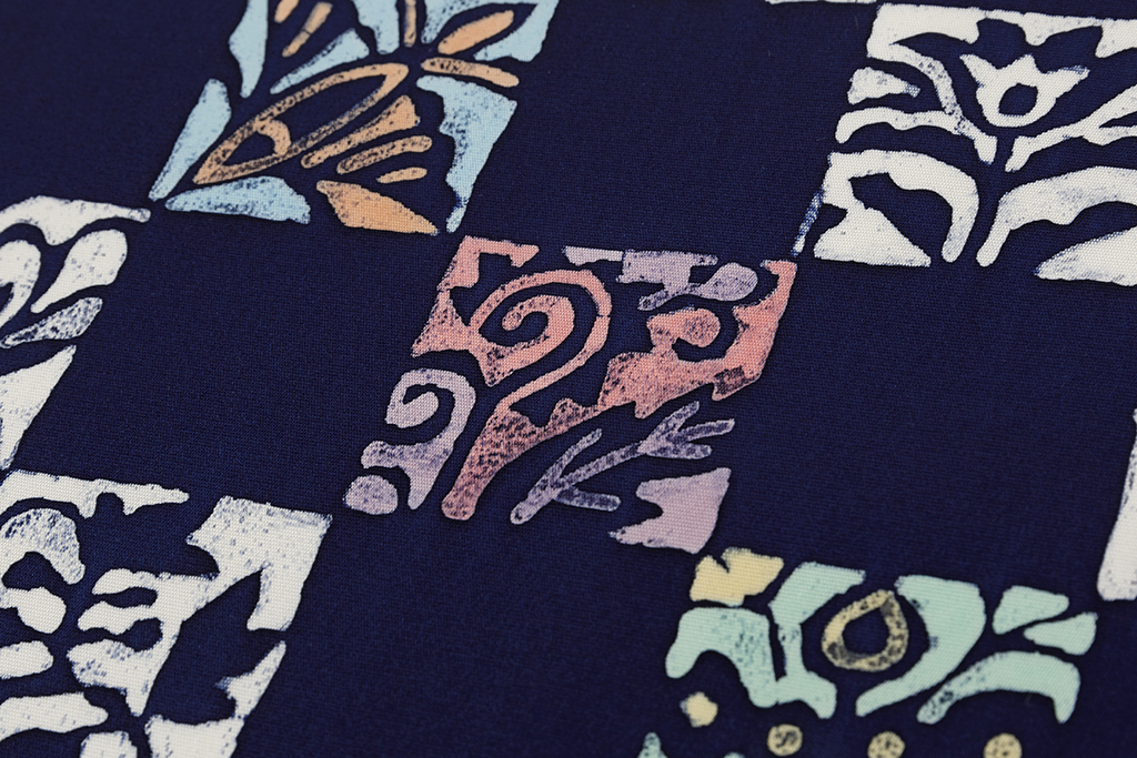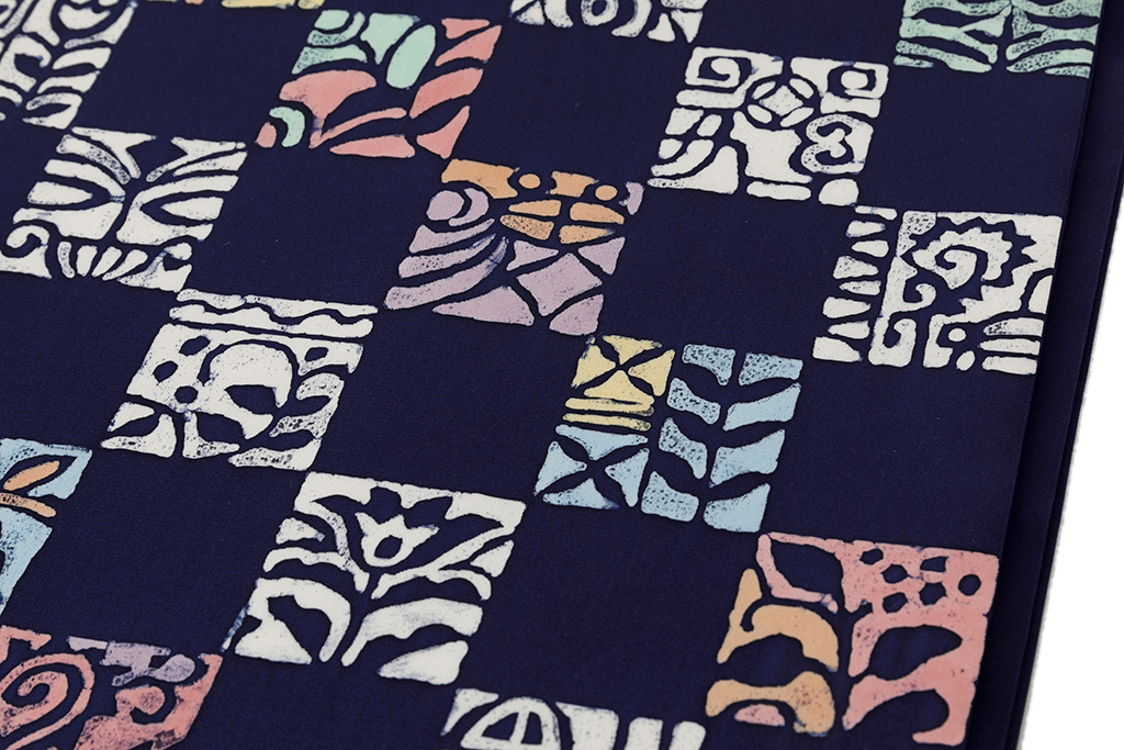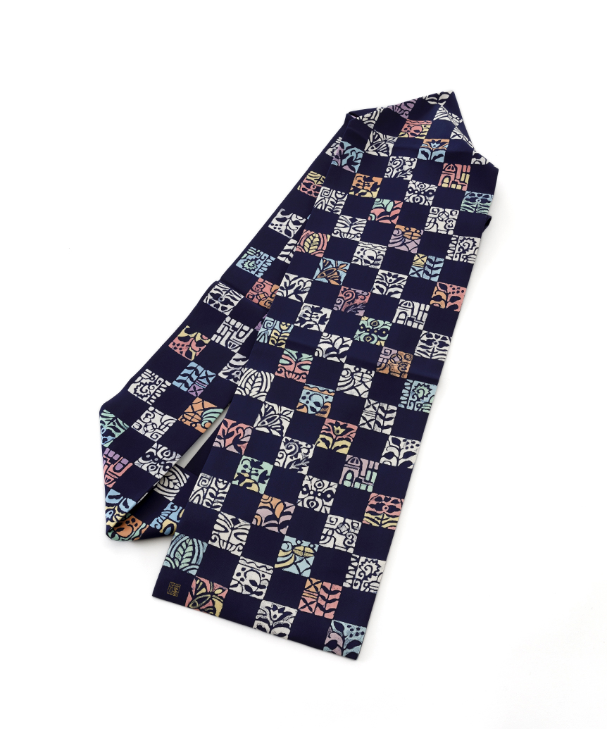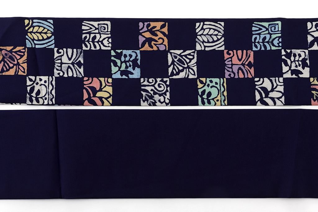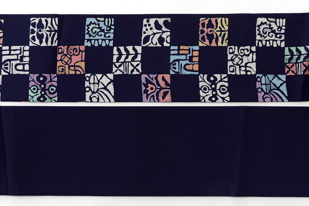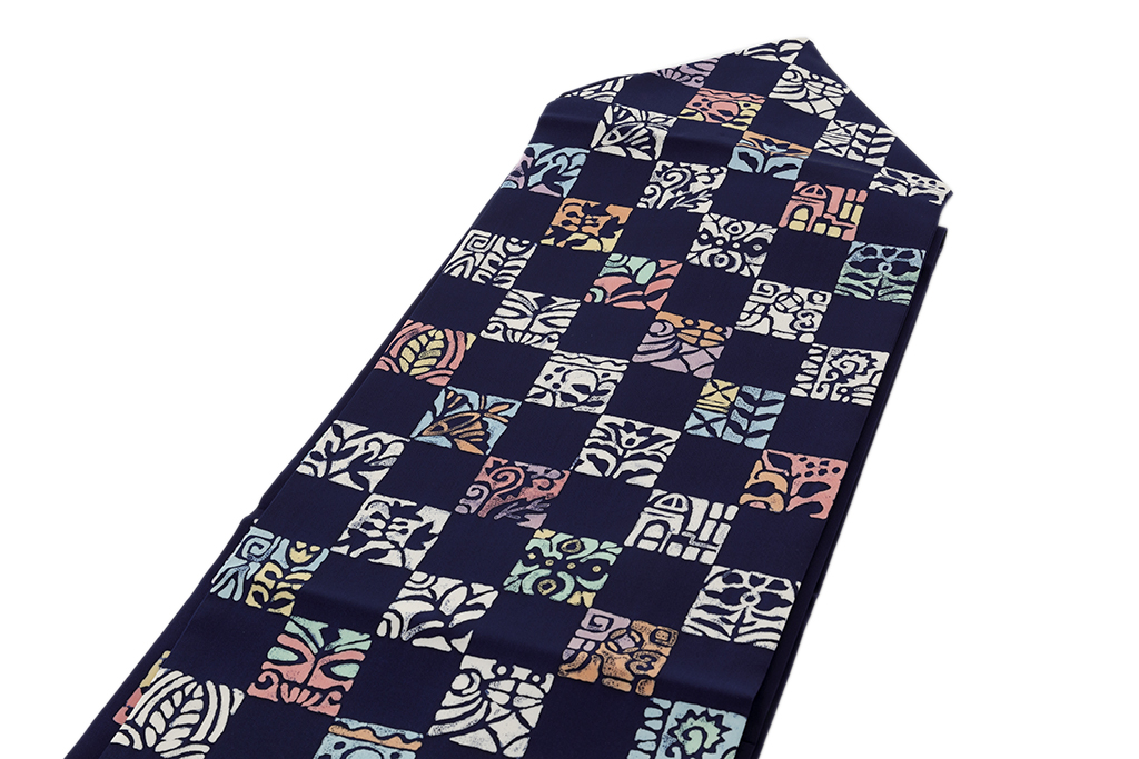 紺色の地に、多用な草花や建物を抽象的に描いた異国風の意匠を四角に切り取り、市松調に並べてモダンな表情を映し出した、美しい色彩感が際立つ腰原淳策さん作 九寸名古屋帯です。