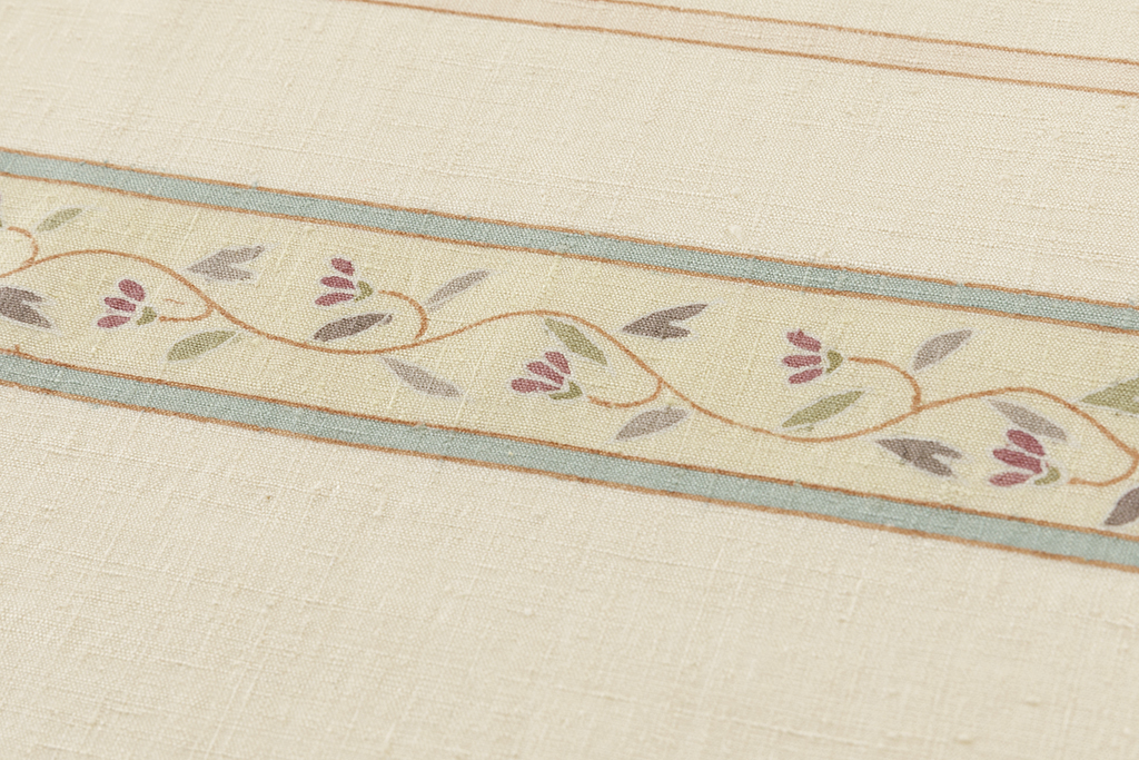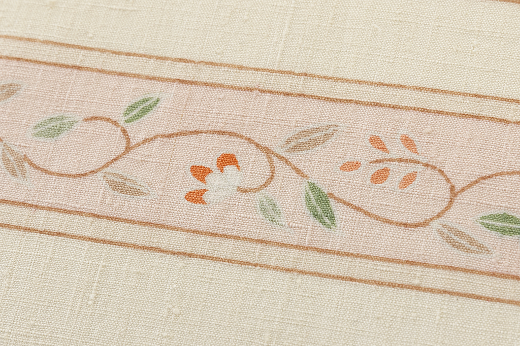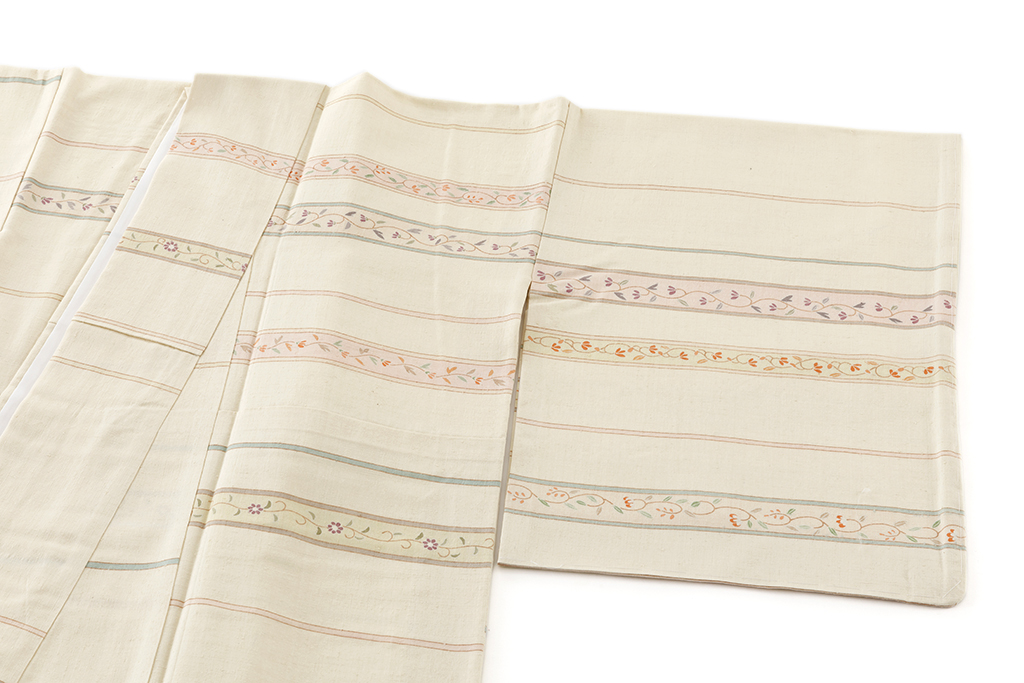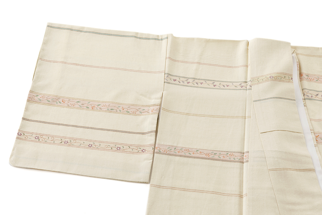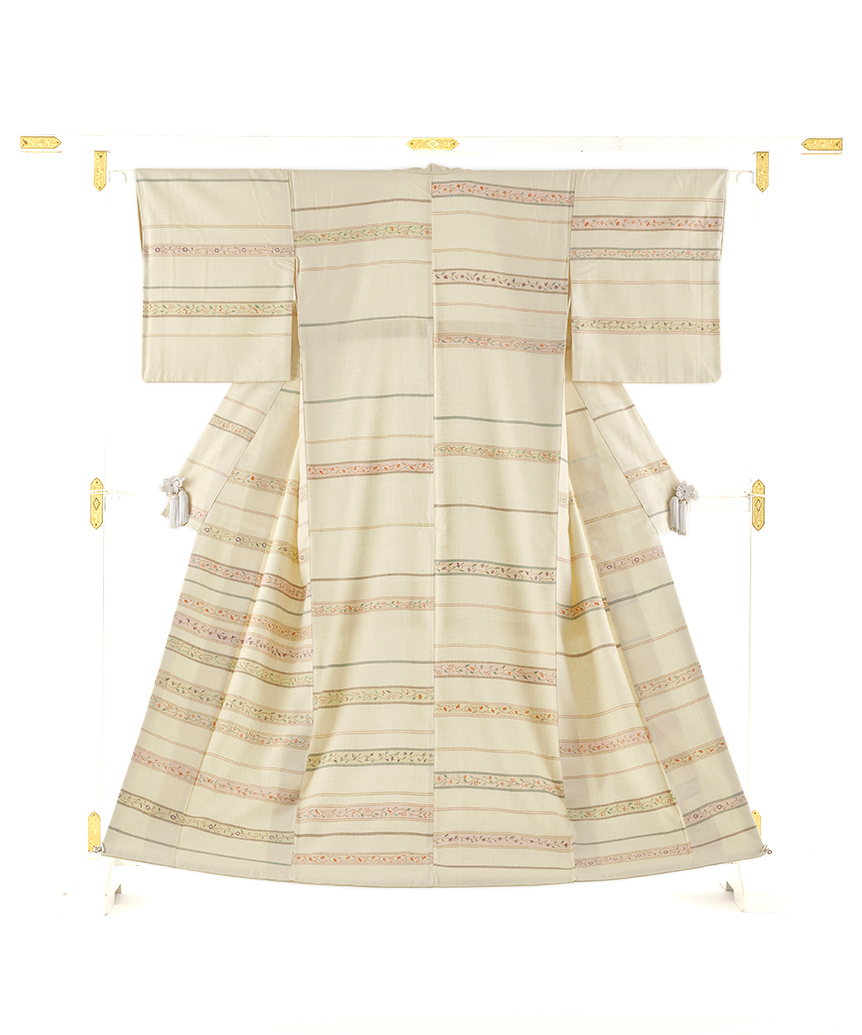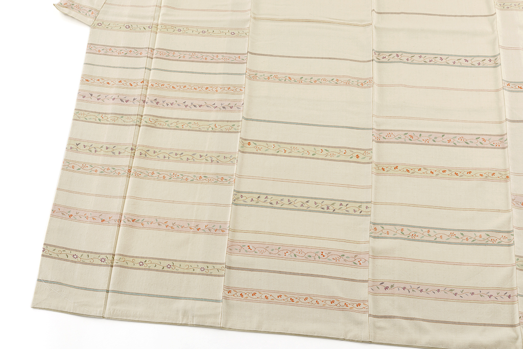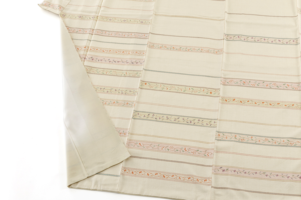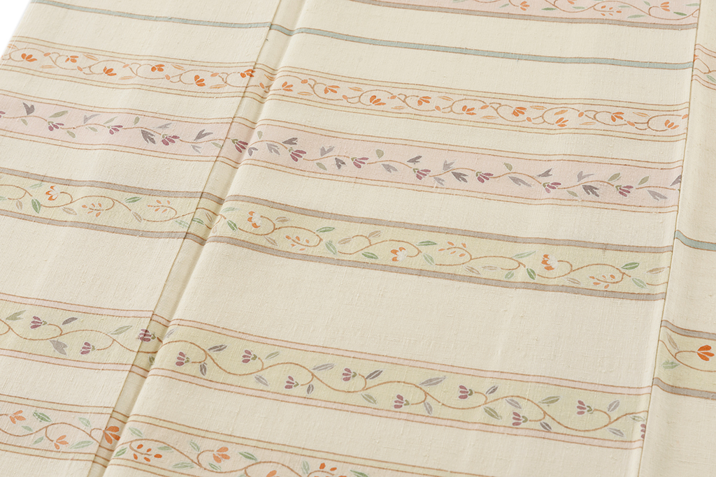 淡い乳白色の結城紬地に、乙女色や硫黄色、若竹色の横段を配し、伸び伝う唐草とともに可愛らしい小花を織り出した、ふんわりと軽やかな紬の織味に繊細な意匠が、可愛い洒落味を感じさせる結城紬地 訪問着です。