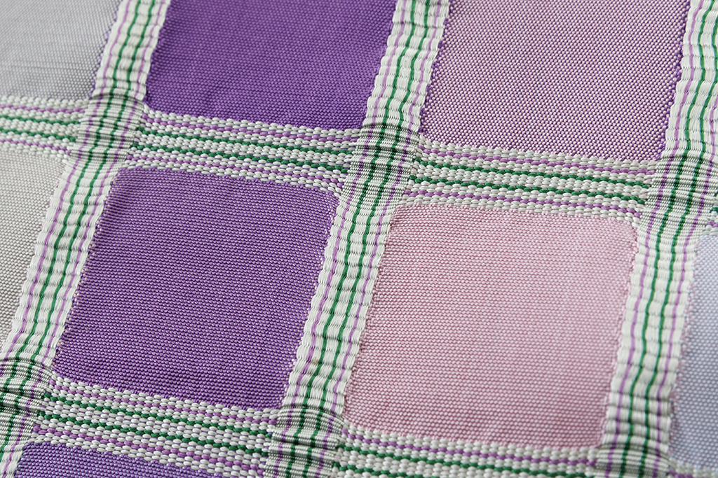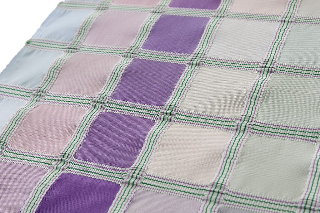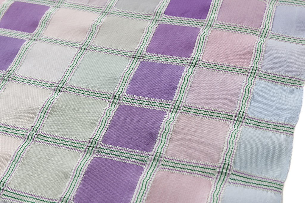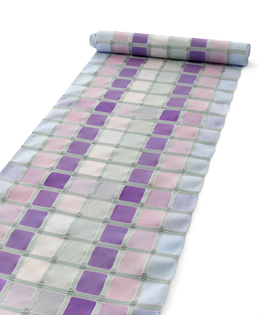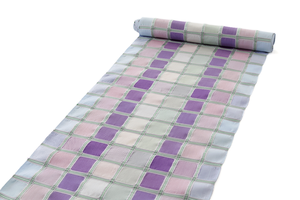 経緯の浮織が交差する吉野格子織に、天青、洎夫藍色、本紫、薄緑などの彩り豊かなお色をリズム良く配色した、まるでパレットに色彩を広げたかのような鮮やかでポップな可愛らしさが愛嬌を感じさせる最上格子織 九寸名古屋帯地 「彩」です。