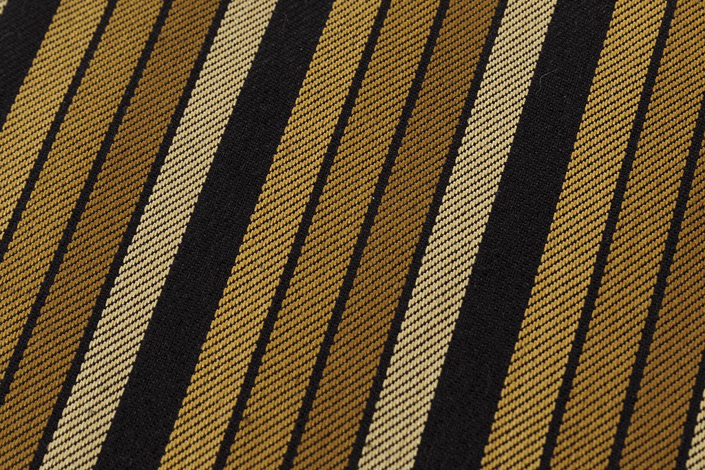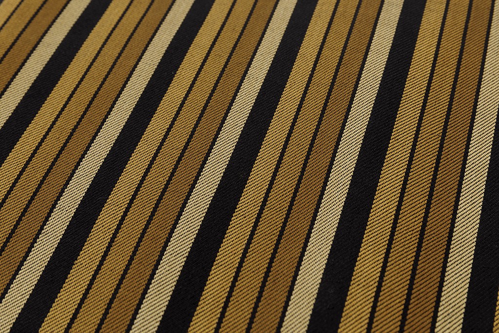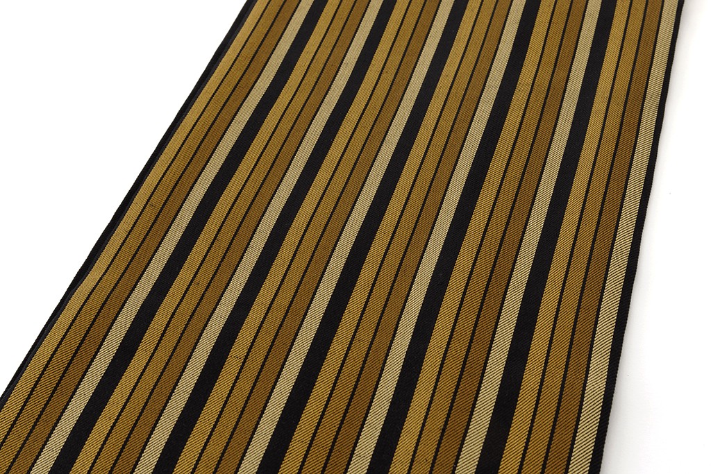 引き締まった黒の地に、緻密な綾織で、黄土色、金色の縦縞を織り出した、美しい絹糸、洗練された織味が端正な景色に艶やかな光沢を生み、上質な装いを引き立てる柳崇さん作 綾織 開き九寸名古屋帯「小松間道」です。