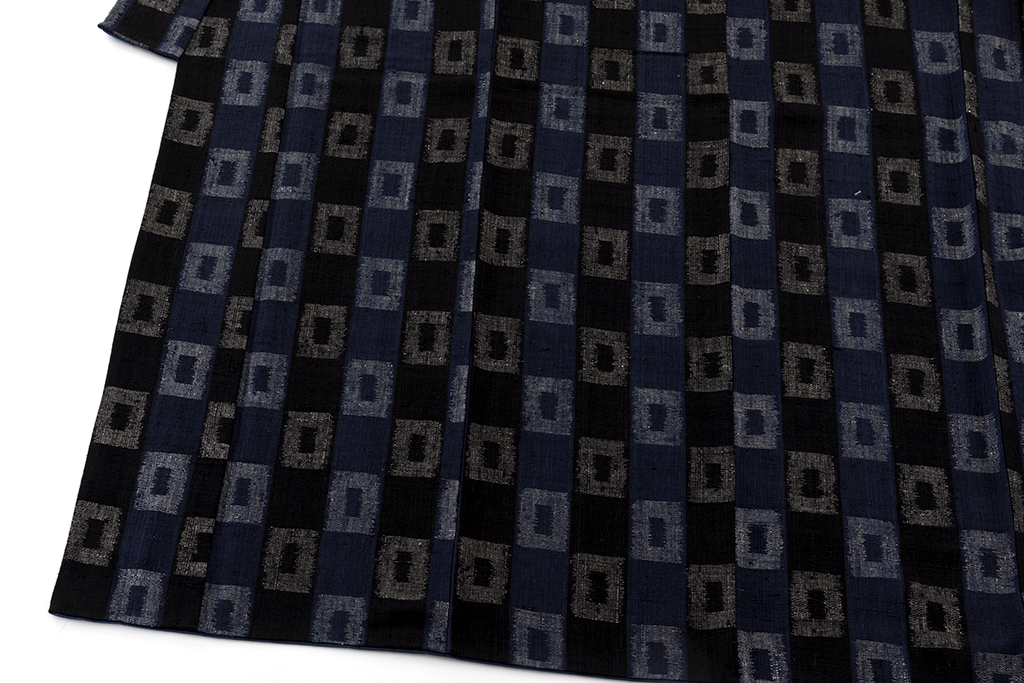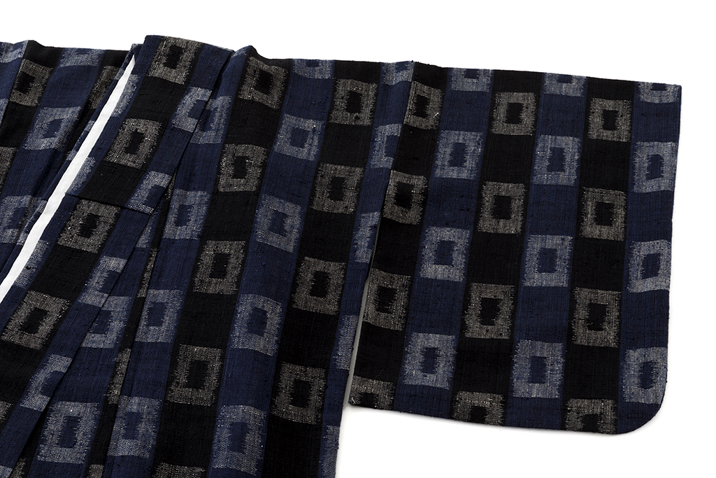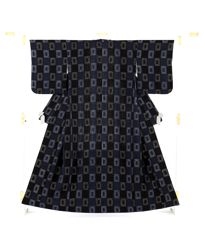 涅色と紺色を緯に配した縦節紬地に、幾何文の絣模様を配した、モダンな表情に際立つ節が野趣豊かな味わいを深める、浦野理一さん作 縦節紬 着物です。