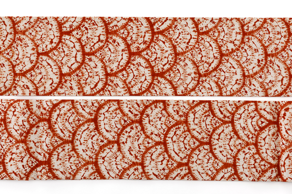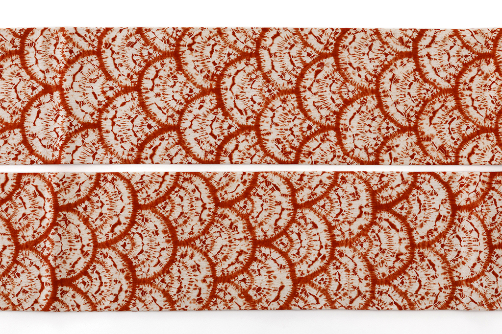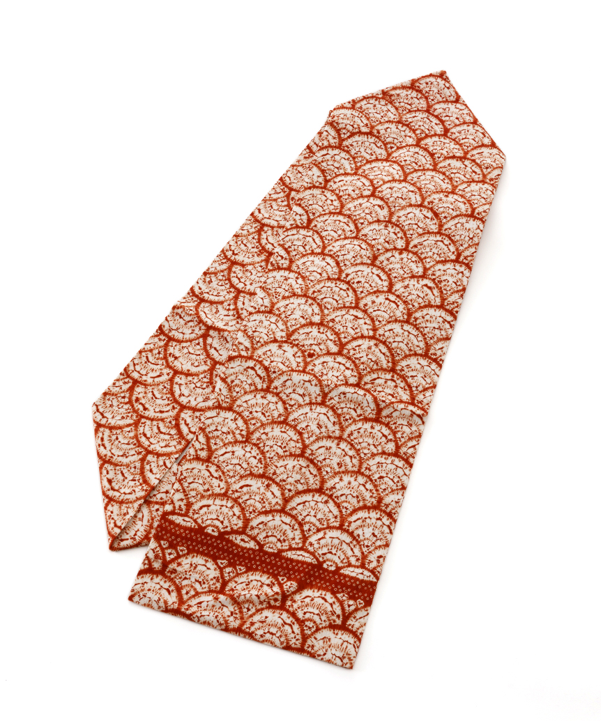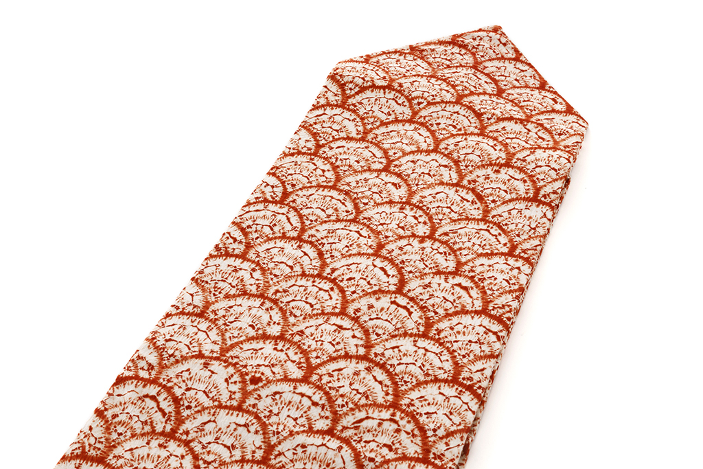 鮮やかな真朱で、青海波文様を連なるように染め出した、繊細な色彩の滲みや掠れが味わい豊かな南部茜染 綿九寸名古屋帯です。