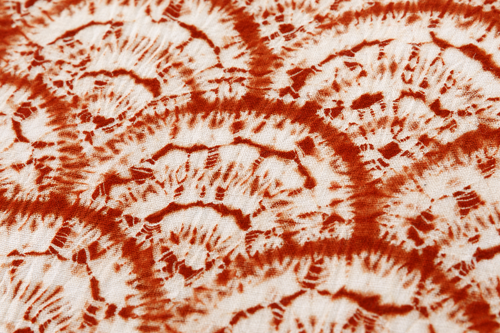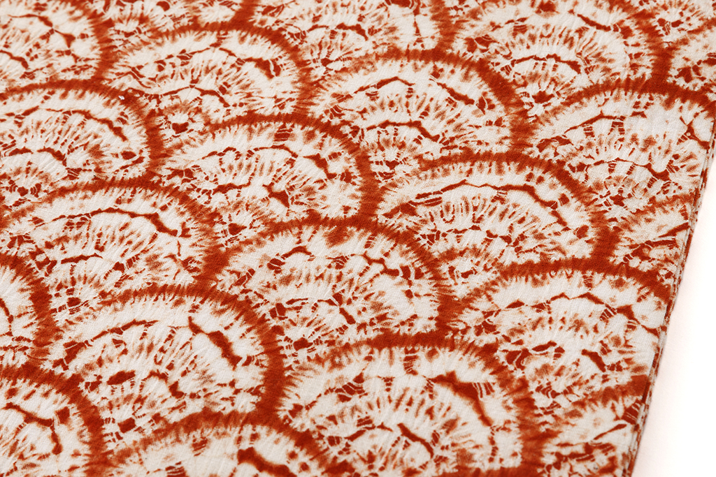 盛岡の草紫堂さんの南部しぼり茜染の着物や帯は、紫根染とおなじく、地元の職人さんの手絞りに、幾度も染めを繰り返し、数年寝かせてようやく仕上がります。また歳月を重ねてお色に深みが出るのも魅力の一つです。
