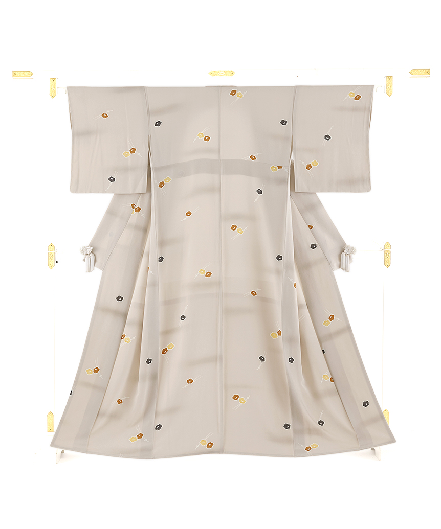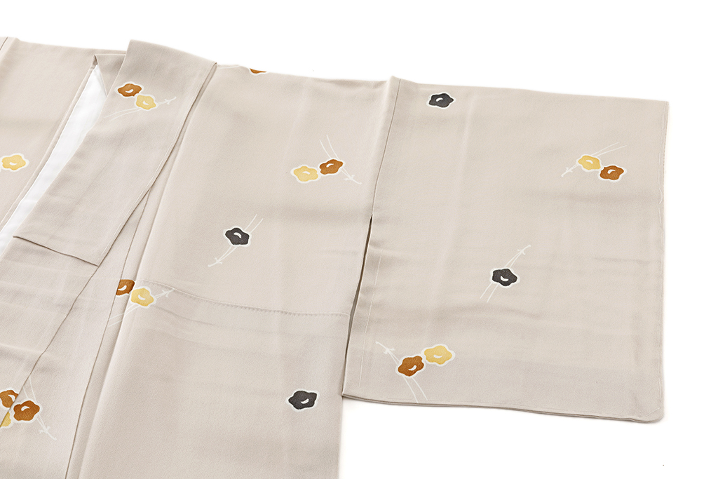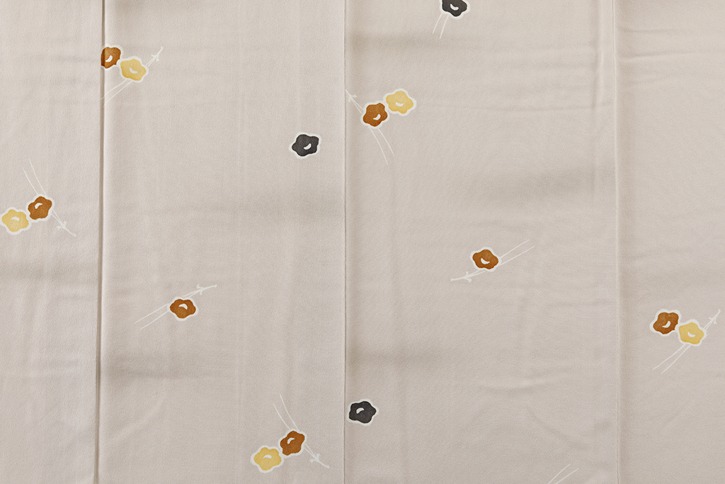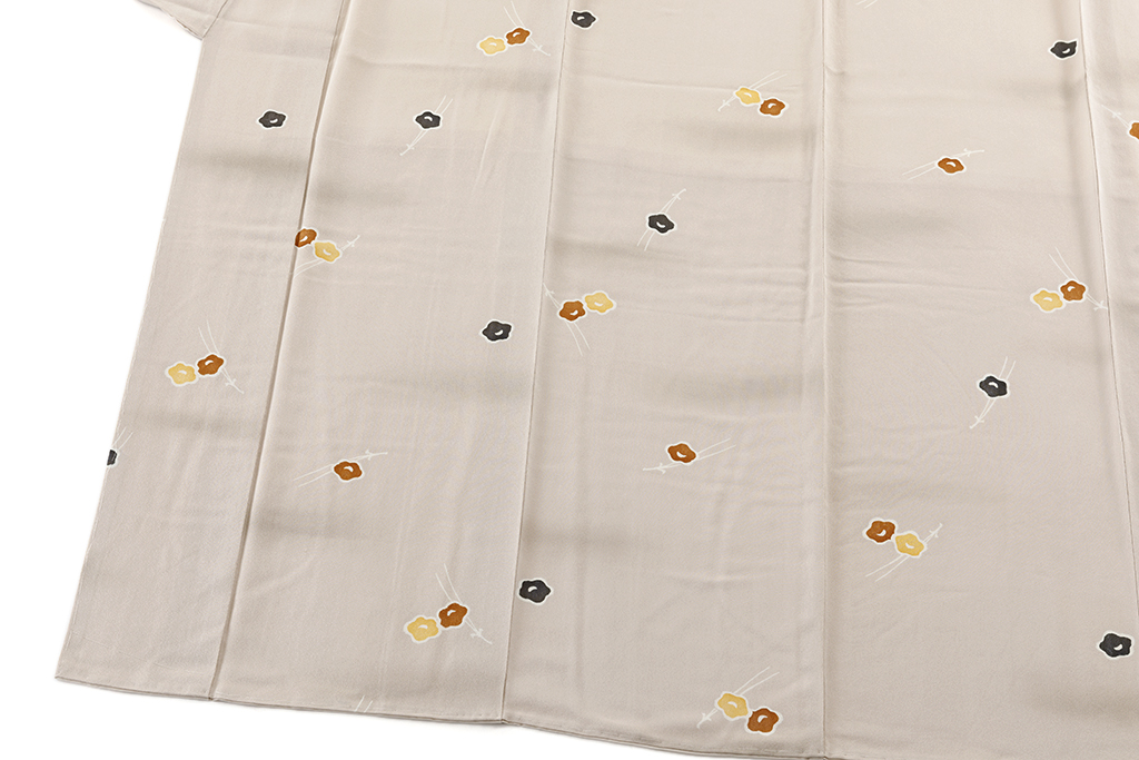 淡い白土の地に、穏やかに舞う松葉とともに、柔らかな色彩で彩られた小花を描いた、はんなりと淑やかな女性美を演出する志ま亀製 小紋です。