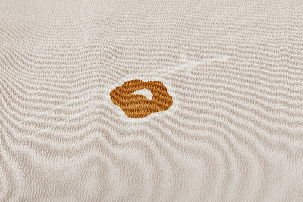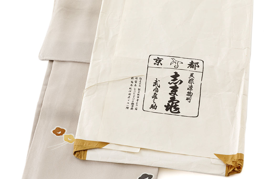 糸目のない友禅技法なので、柄の輪郭がすっきりと立ち上がっているのも、志ま亀のこだわりの1つで、いかにも典雅な筆づかいで、花兎、鼓、扇面、宝尽くし、松葉、玩具などの古典的なモチーフが詩的に描かれる塩瀬染め帯も高い人気を集めています。