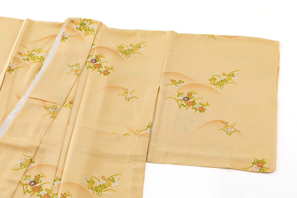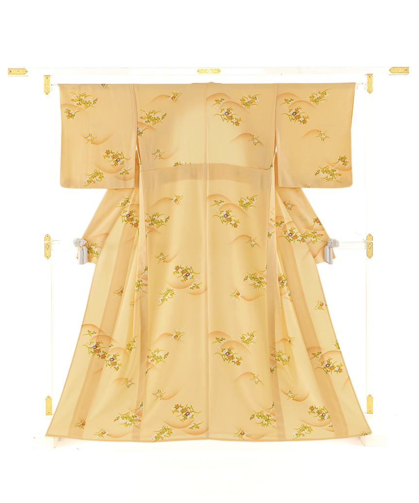 柔らかな薄柑子の地に、鮮やかな色調で、穏やかな表情の遠山に菊や桐などの艶やかな草花を咲かせた、瑞々しく彩られた花々が可愛らしく朗らかな装いを演出する志ま亀製 単衣 小紋です。