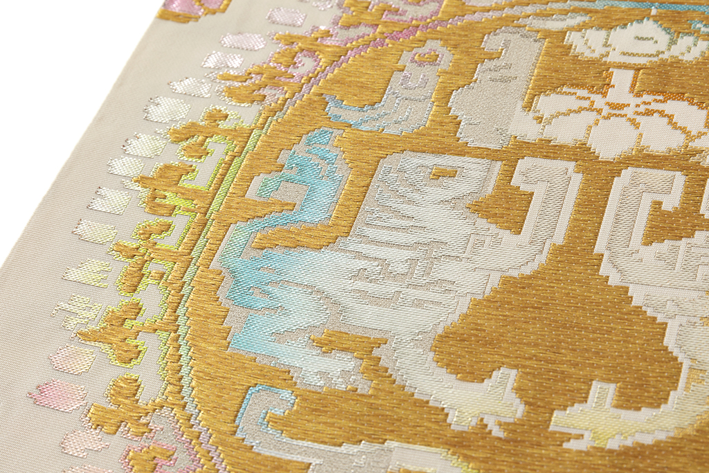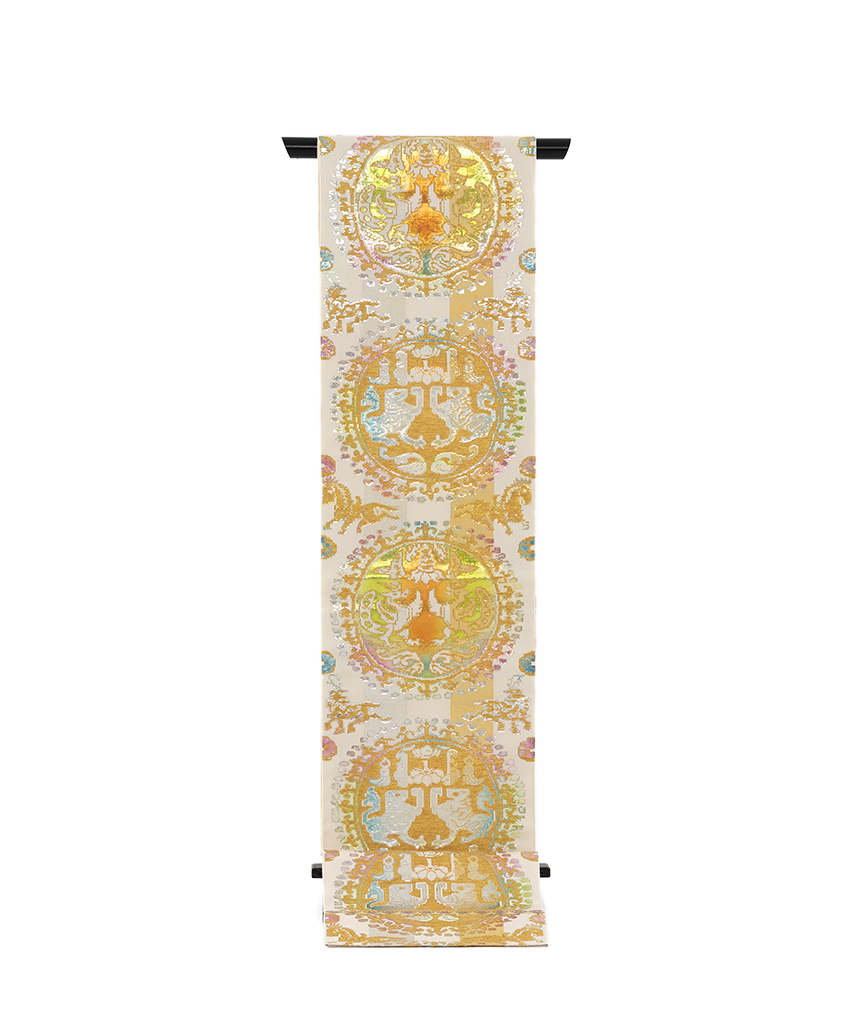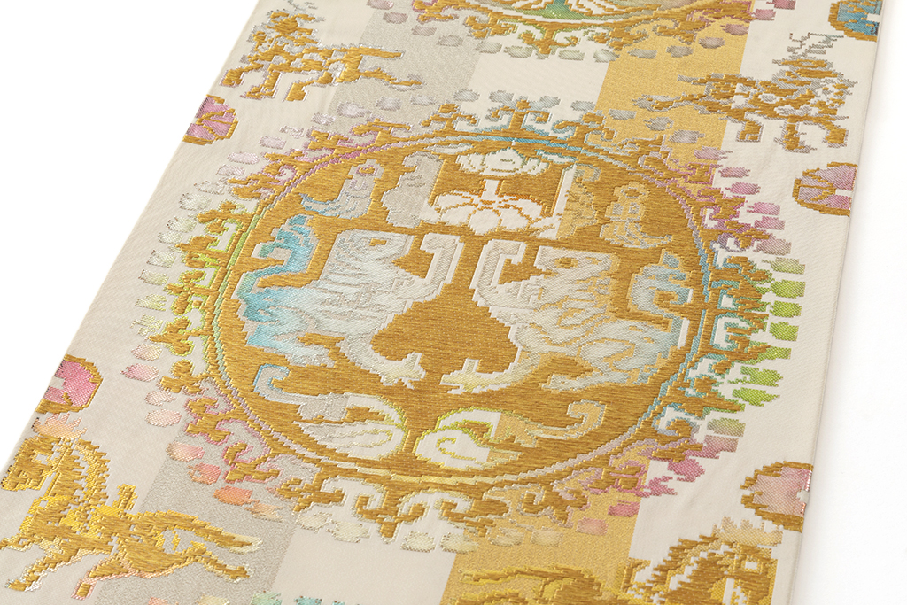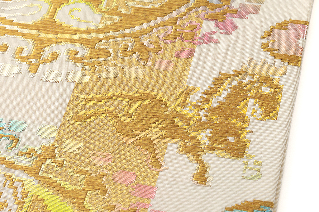 温かな乳白色の地に、金糸、銀糸と煌めく鮮やかな糸を用いて、向かい合う白虎を描いた迫力ある円文、跳ねる馬や躍動感溢れる鹿を織り上げた豪勢で華やかな龍村平蔵製 袋帯「円文白虎錦」です。