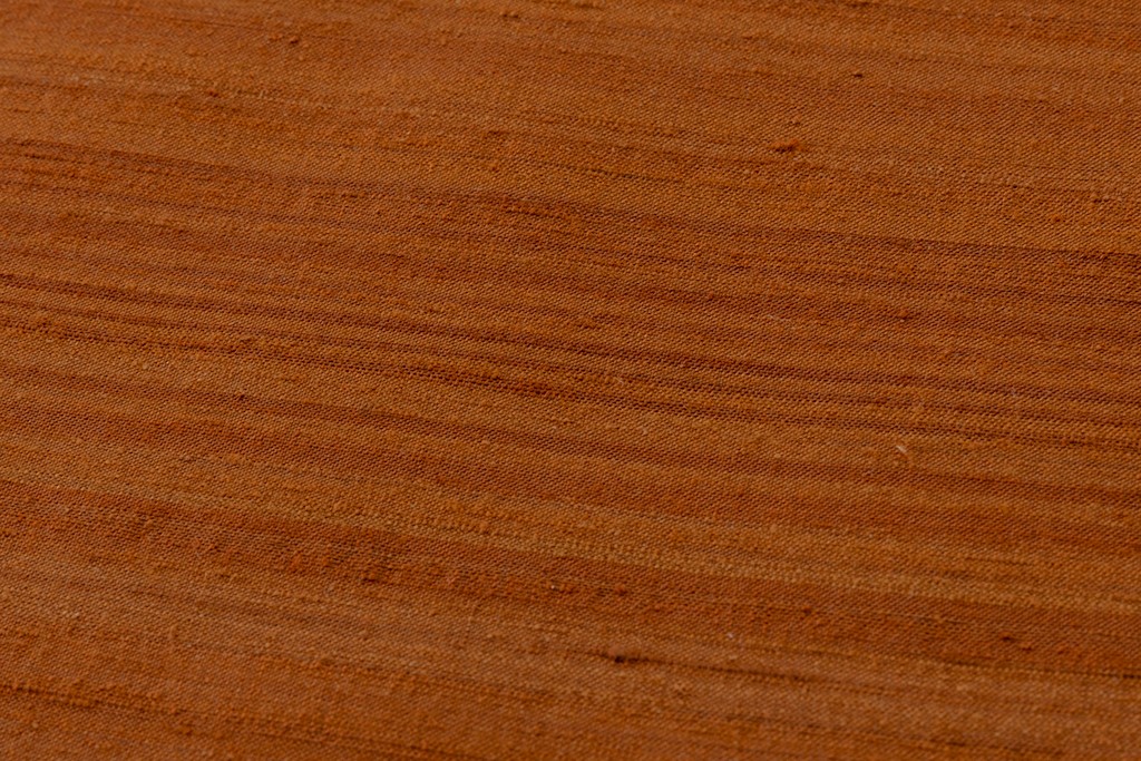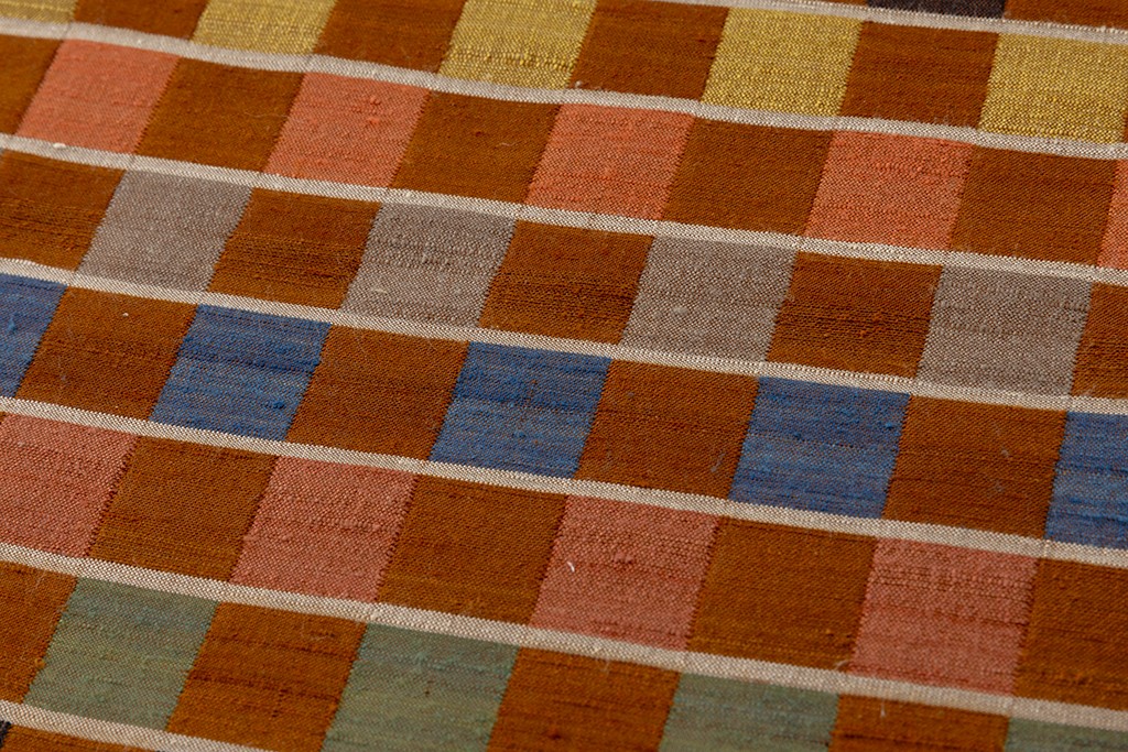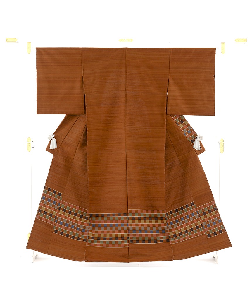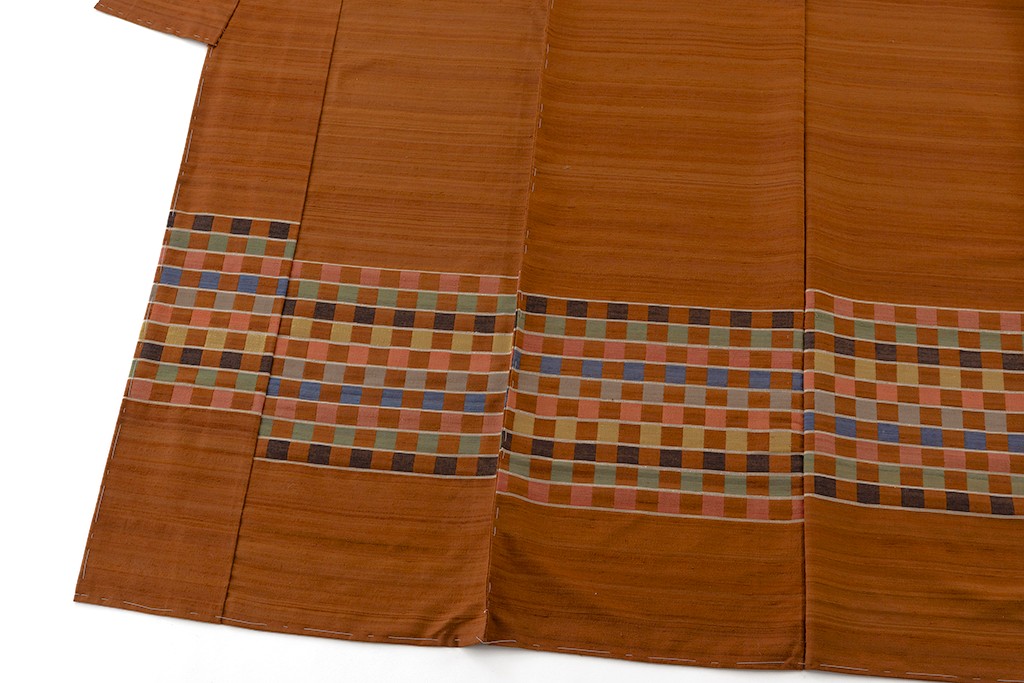 温かみのある赤白橡の紬地に、麹塵、一重梅、縹色、黄水仙などの多彩な色糸を用いて、可愛らしい紋織を市松調に配した横段を織り出した、色彩豊かな彩が心地よく弾む、穏やかでモダンな表情が優しい織味を引き立てる人間国宝 佐々木苑子さん作 紋織 紬訪問着地です。